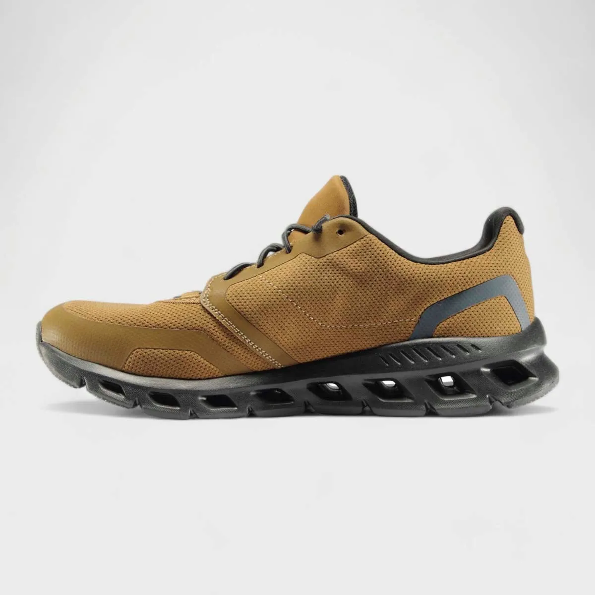Легкая беговая обувь. Подчеркивается ее сетевая структура, которая способствует вентиляции, но при этом имеются дополнительные укрепления термопластичными элементами, которые обеспечивают дополнительную защиту в носке, а также исключают швы и ненужные детали.