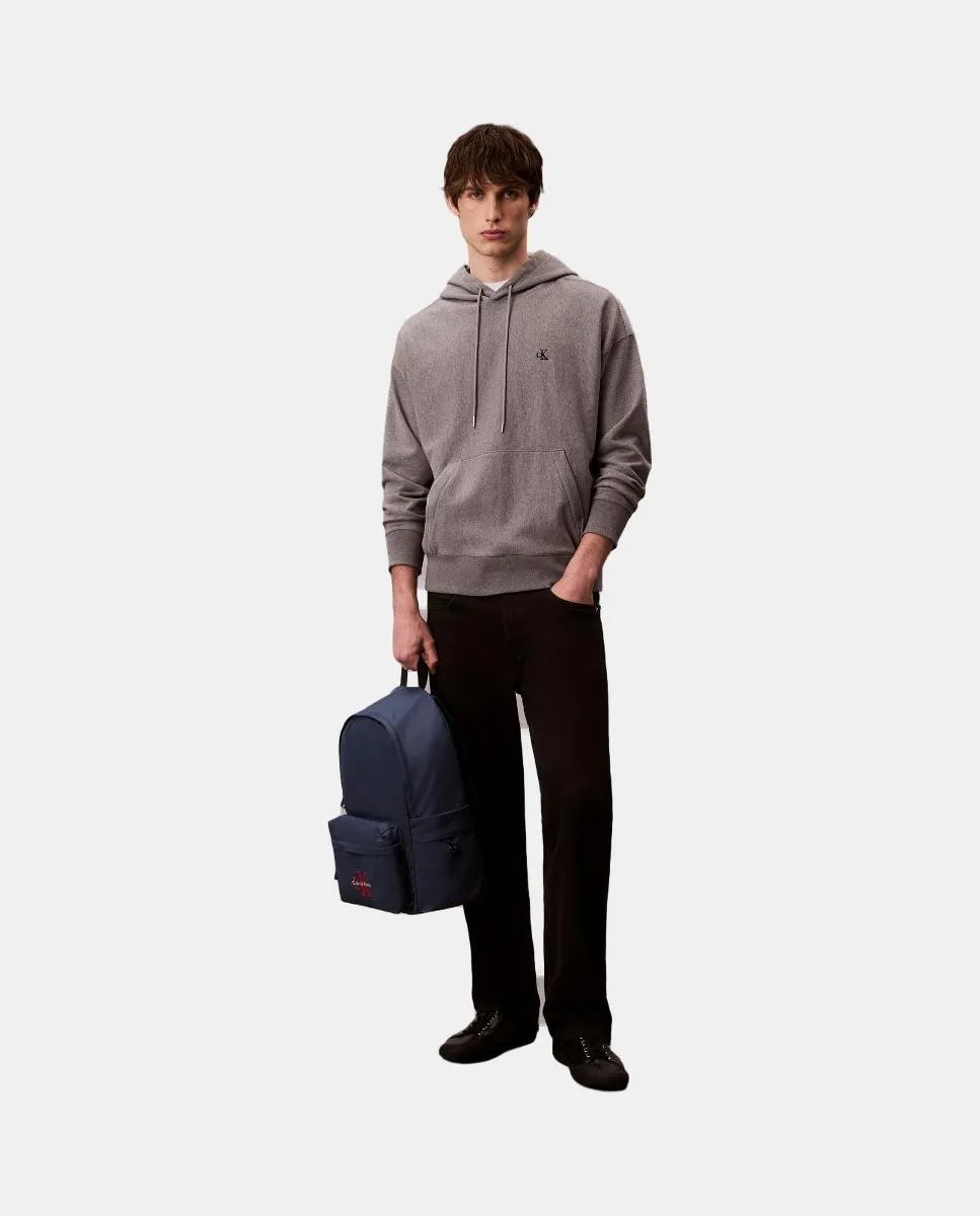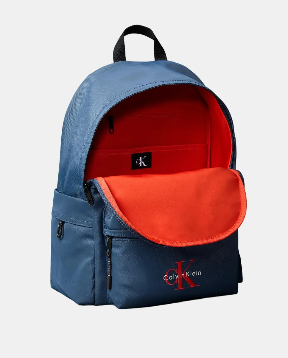 Синий нейлоновый рюкзак с вышитым оранжевым логотипом CK на переднем кармане. Оба кармана с застежкой-молнией. Двойная регулируемая ручка.