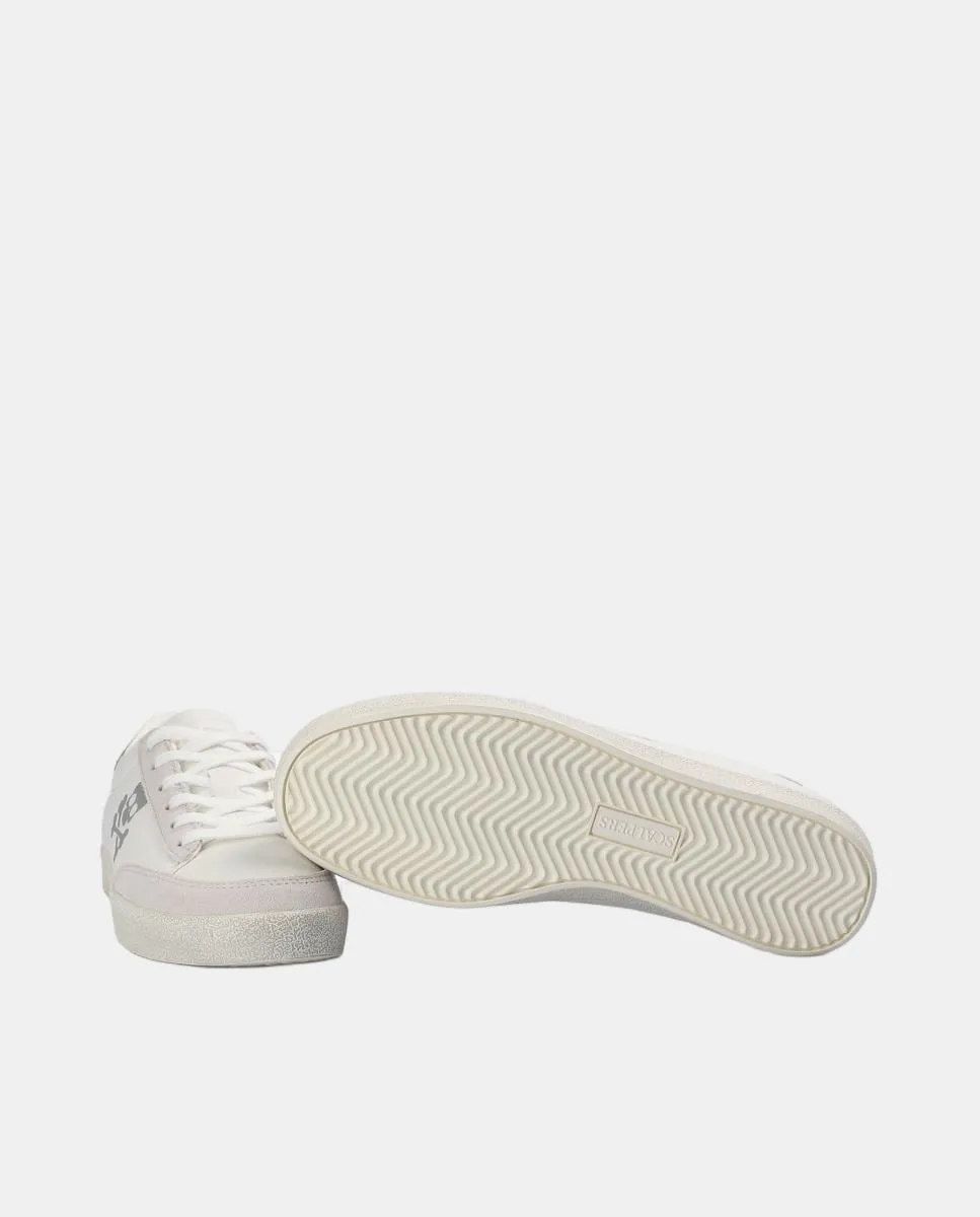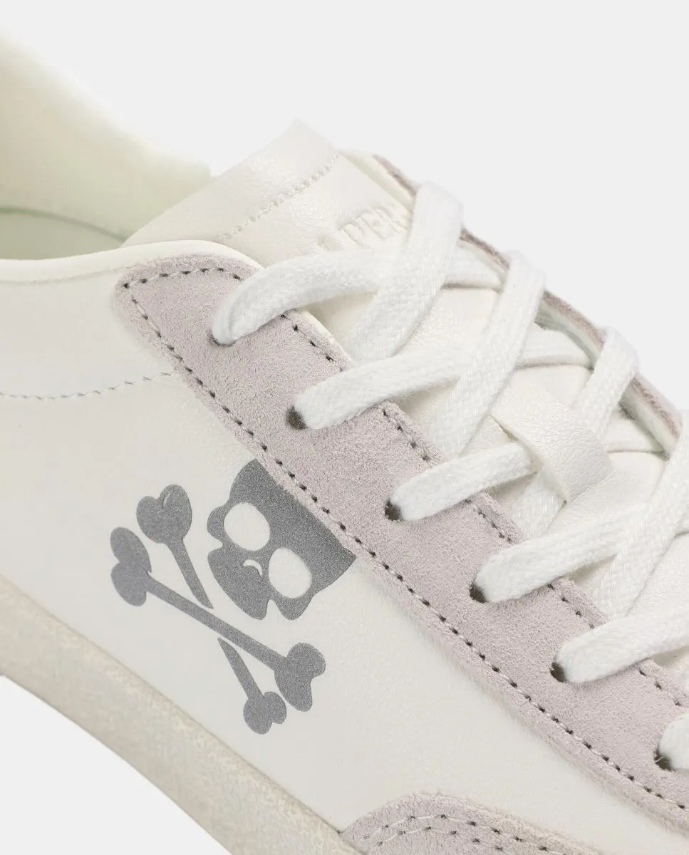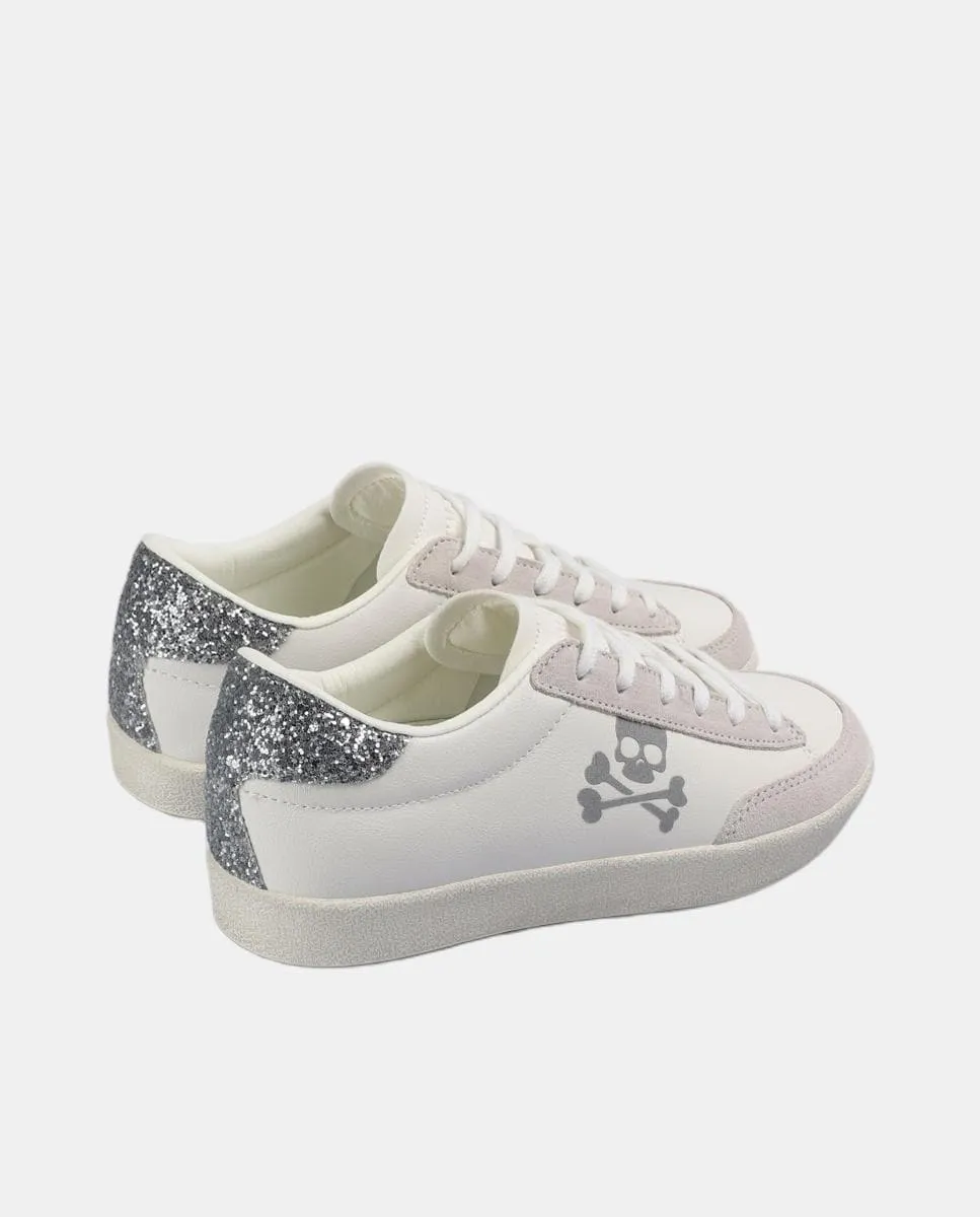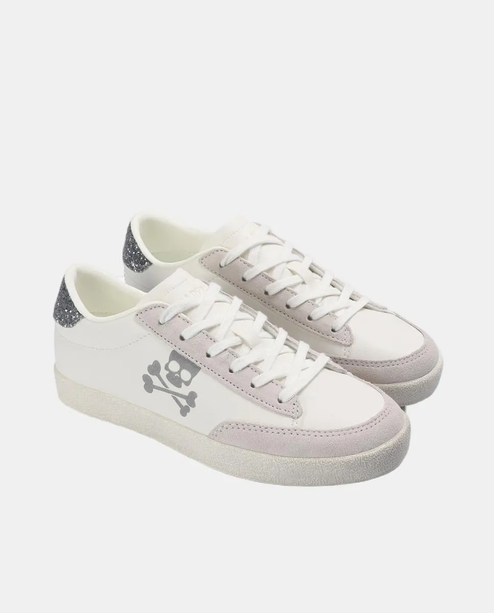 Низкие кроссовки с логотипом в виде черепа контрастного цвета на боку. Сшиты из смеси замши, микрофибры и полиуретана. Застежка на шнуровке. Резиновая подошва. Контрастная деталь с блестками на пятке.