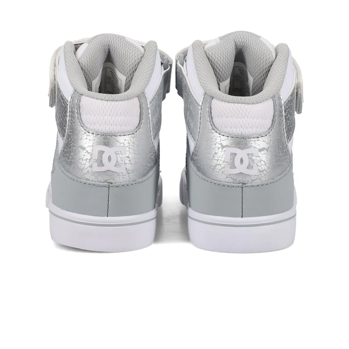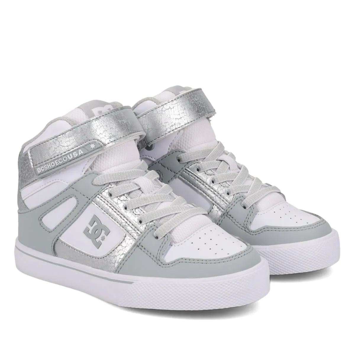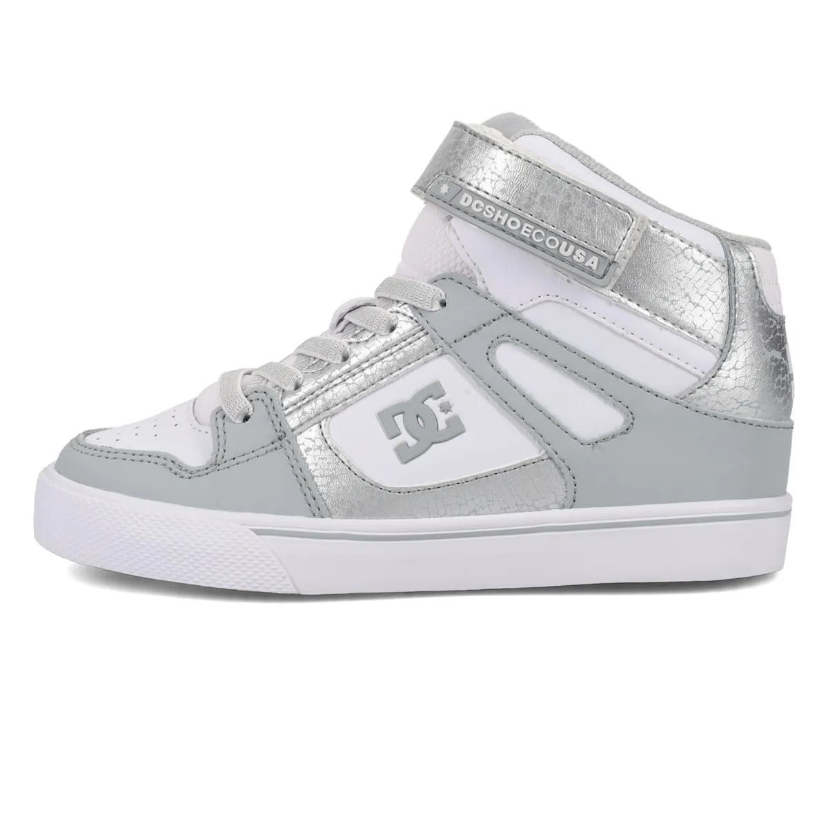 Высокие кроссовки для детей. Характеристики включают: Материал: верх из комбинации кожи, замши или текстиля, внутренний слой из сетки, язычок и воротник с пенополиуретановой подкладкой для дополнительного комфорта и поддержки, формованный TPU-люверс, носок для увеличенной прочности, вентиляционные отверстия для лучшей воздухопроницаемости, наружная подошва из устойчивой к истиранию резины, рисунок подошвы Pill Pattern, зарегистрированный брендом DC, конструкция cupsole.