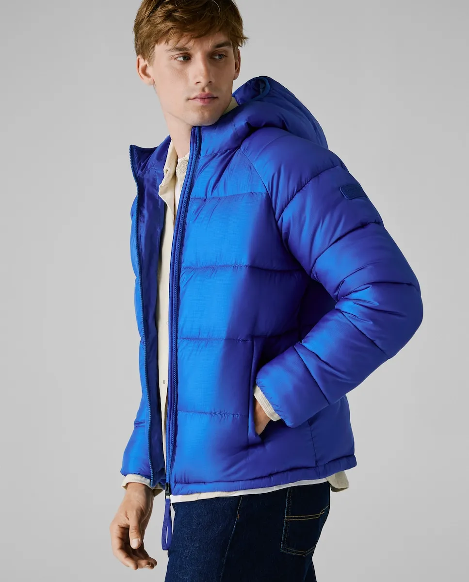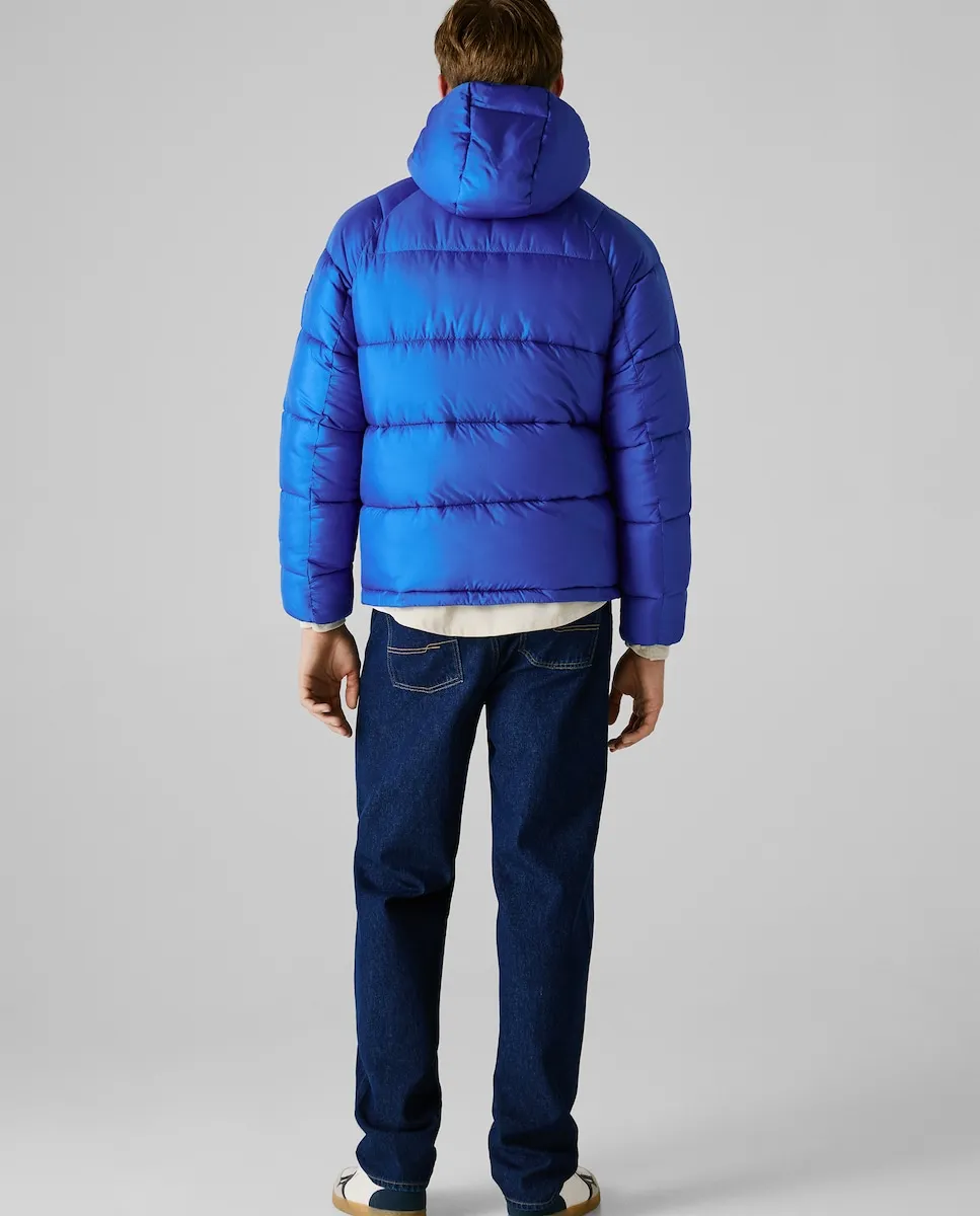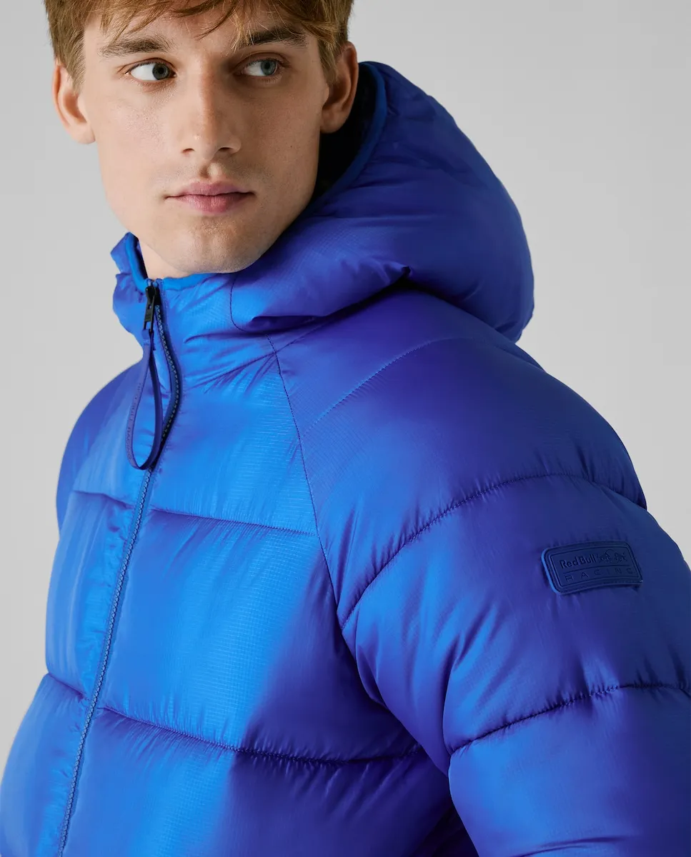 Пуховик из коллекции Red Bull Racing с горизонтальными стегаными панелями из ветро- и водоотталкивающей ткани, фиксированным капюшоном и фронтальной застежкой-молнией. Индивидуальный язычок бегунка с рельефным логотипом, боковые карманы с окантовкой и логотип PEPEJEANS, нанесенный на верхнюю часть капюшона.