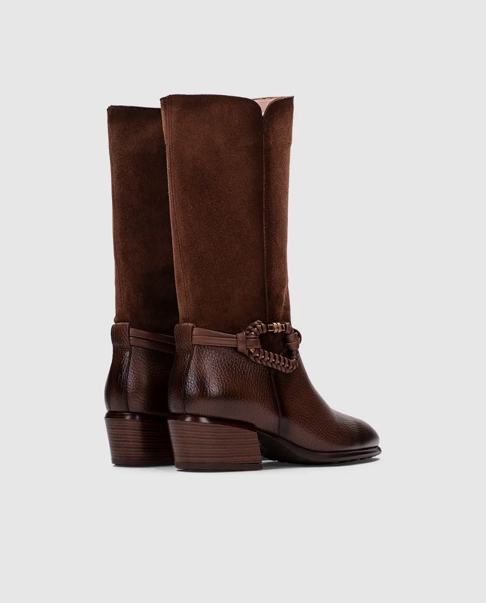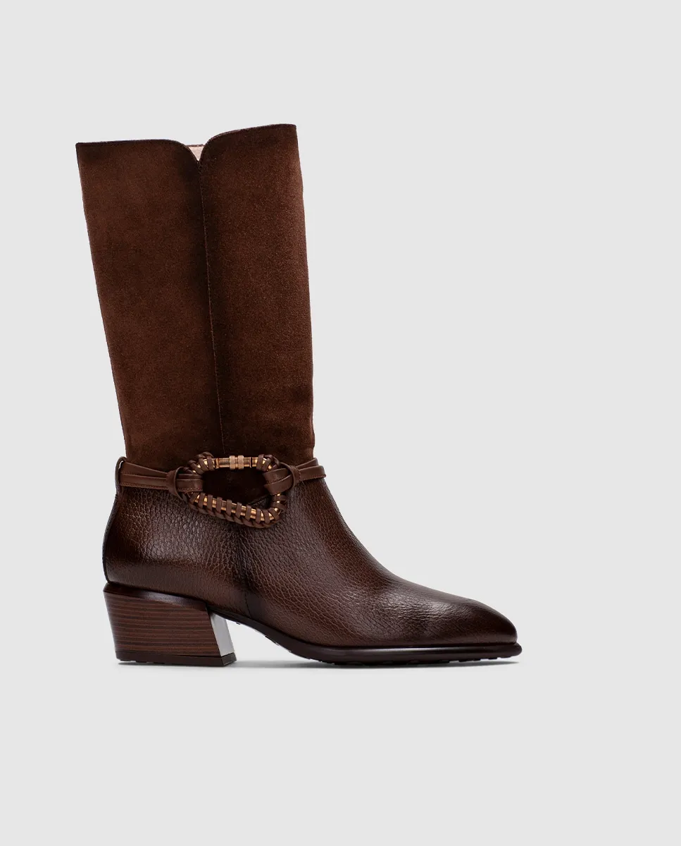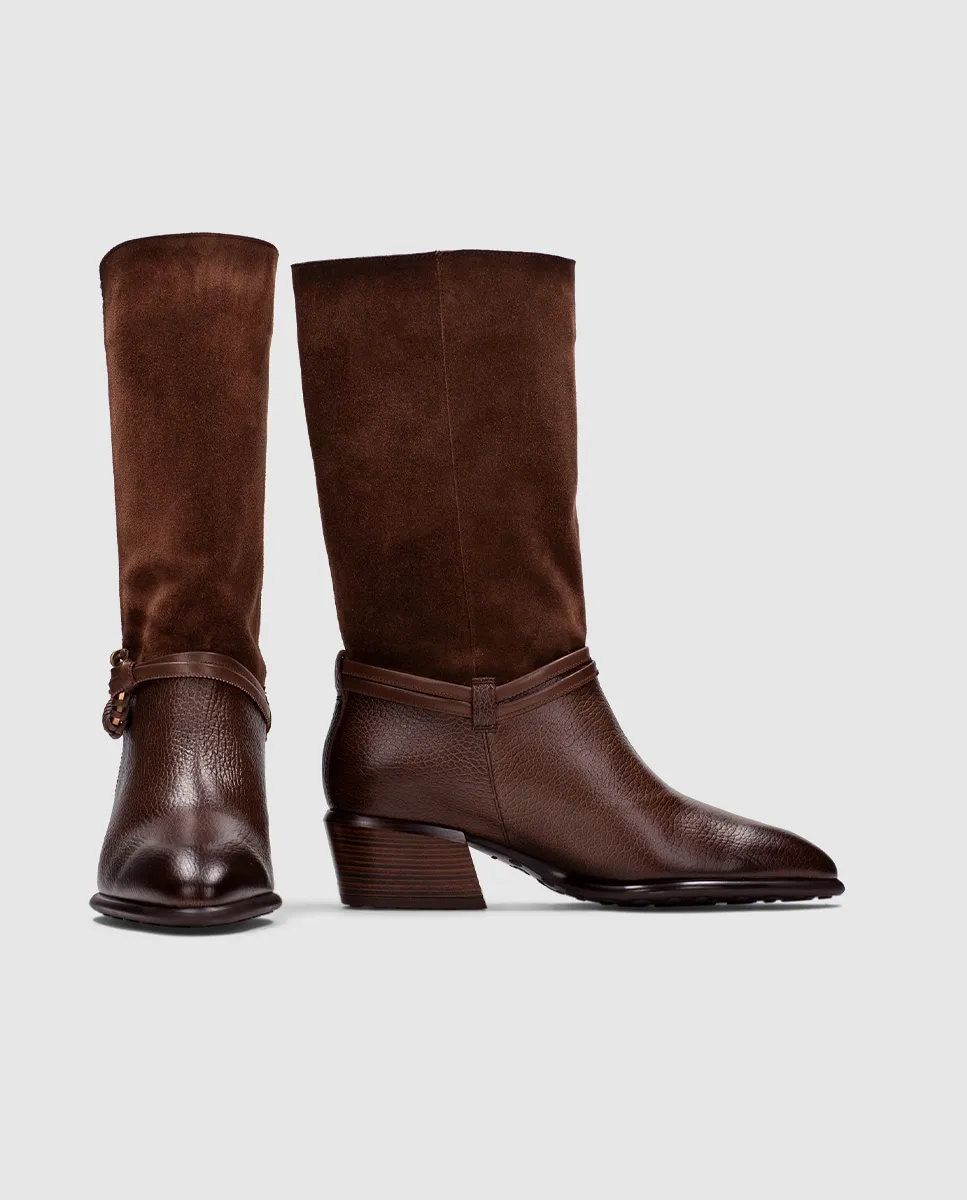 Ковбойские сапоги. Деталь-украшение в виде карабина, обтянутого кожей. Подошва из материала с эффектом резины с рисунком протектора и кубинский каблук высотой 5 см с деревянной отделкой. Изготовлены из кожи с комбинированной текстурой и замши. Внутренняя подкладка из не животного происхождения, 100% дышащая и терморегулирующая. Технология Triflow: тройная амортизация в области стопы, которая поглощает удары и обеспечивает эффект подушки при ходьбе. Идеальный баланс между изысканностью и комфортом.