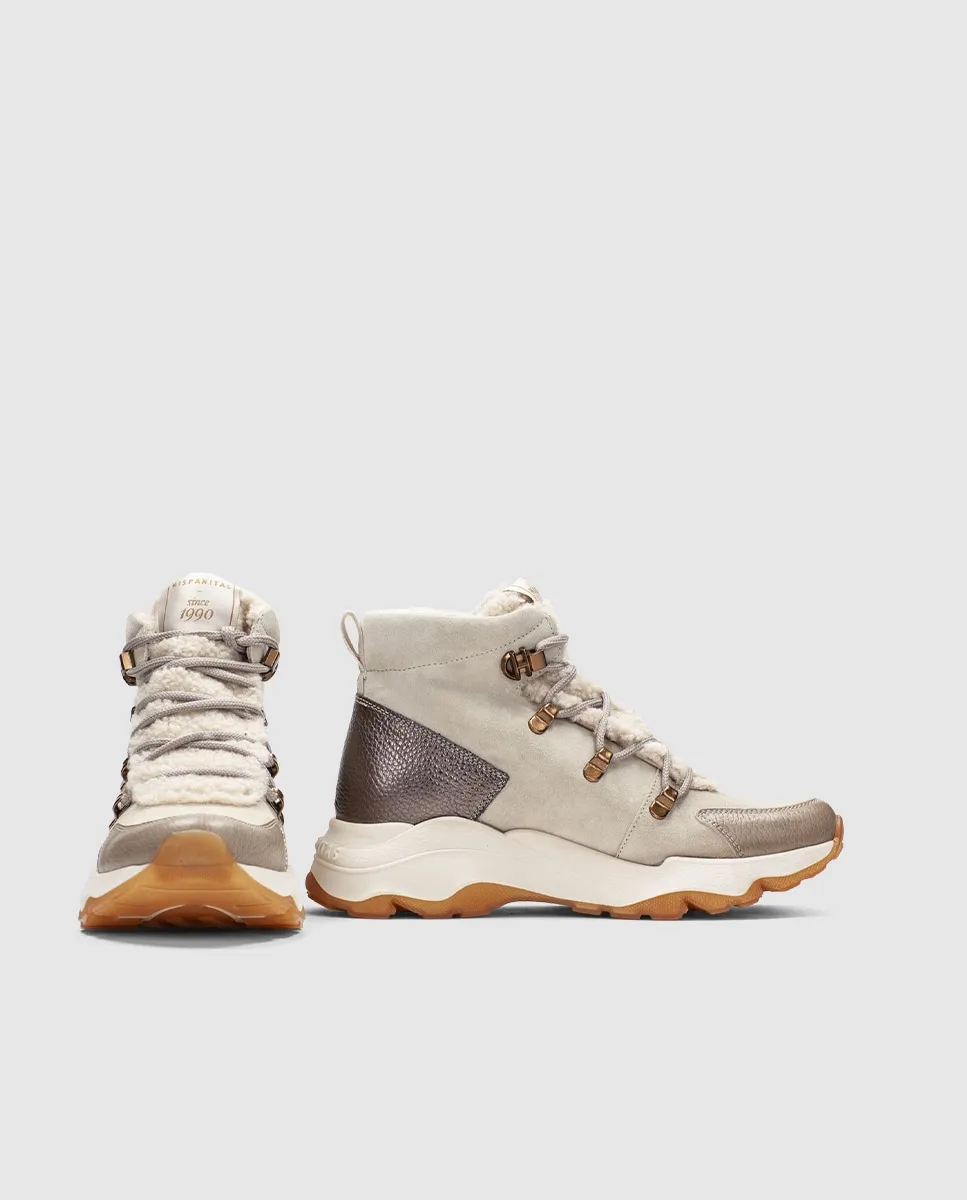 Дезинфицированный спортивный ботинок с шнуровкой и язычком из ткани с эффектом овчины не животного происхождения. Деталь с двойной буквой H сбоку. Подошва из термопластичной резины высотой 4 см. Изготовлен из кожи. Внутренняя подкладка не животного происхождения, 100% дышащая и терморегулирующая.