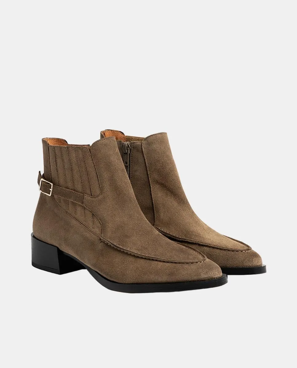 Женские ботинки челси из замши цвета серо-коричневого с декоративной строчкой на верхней части.