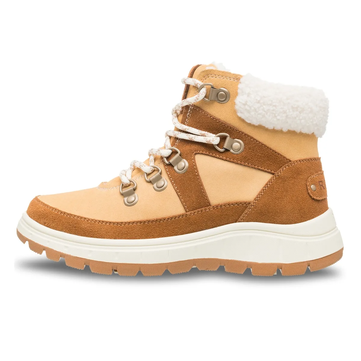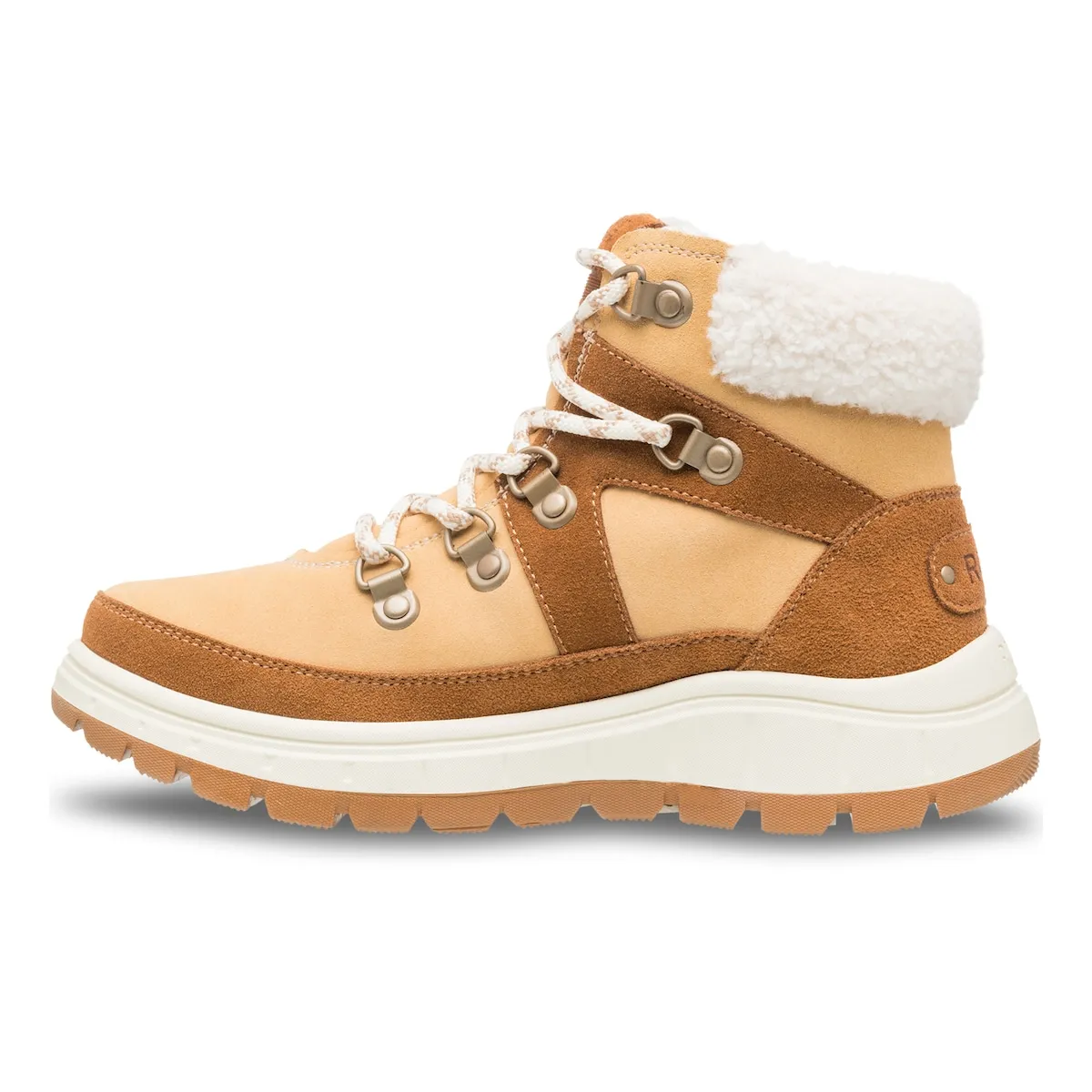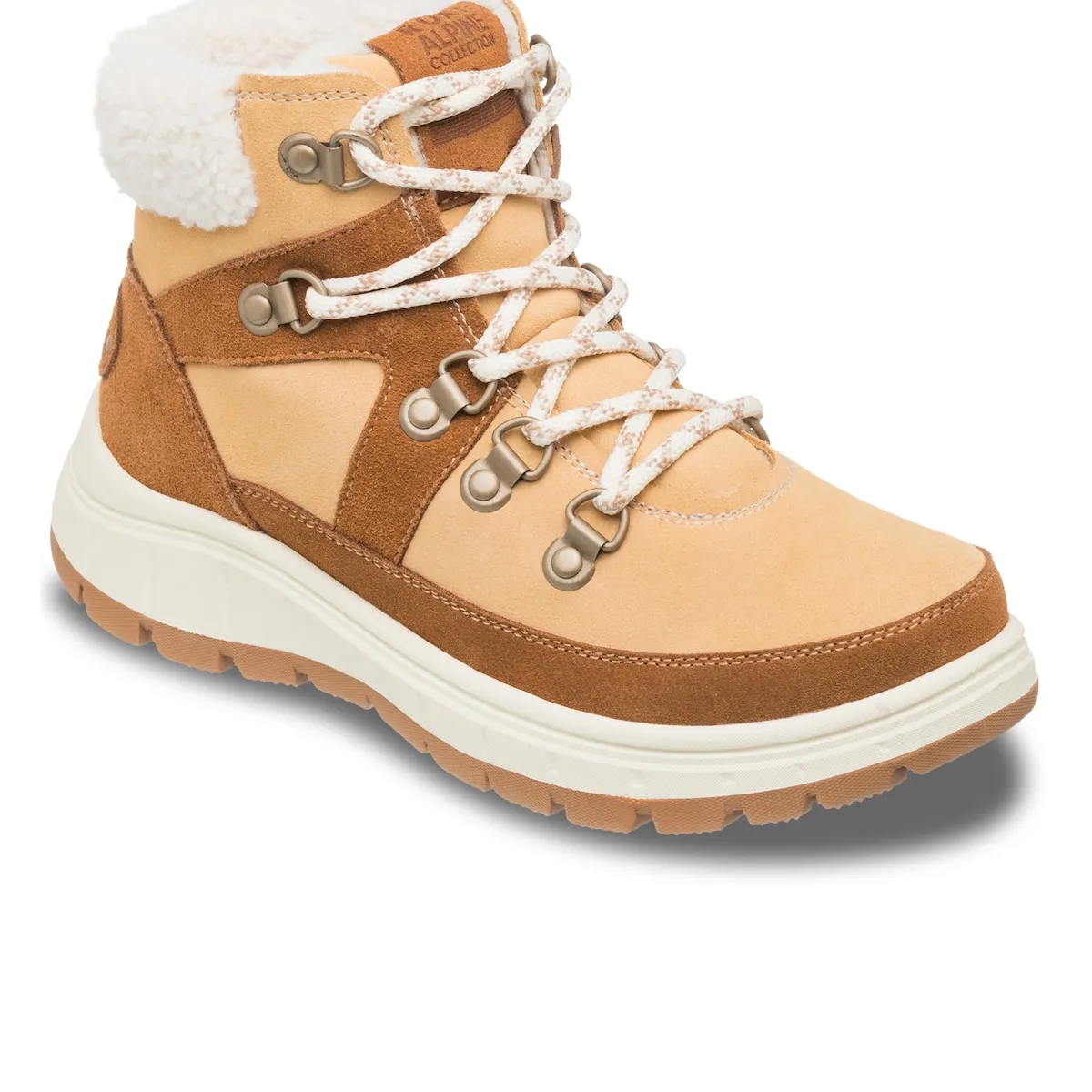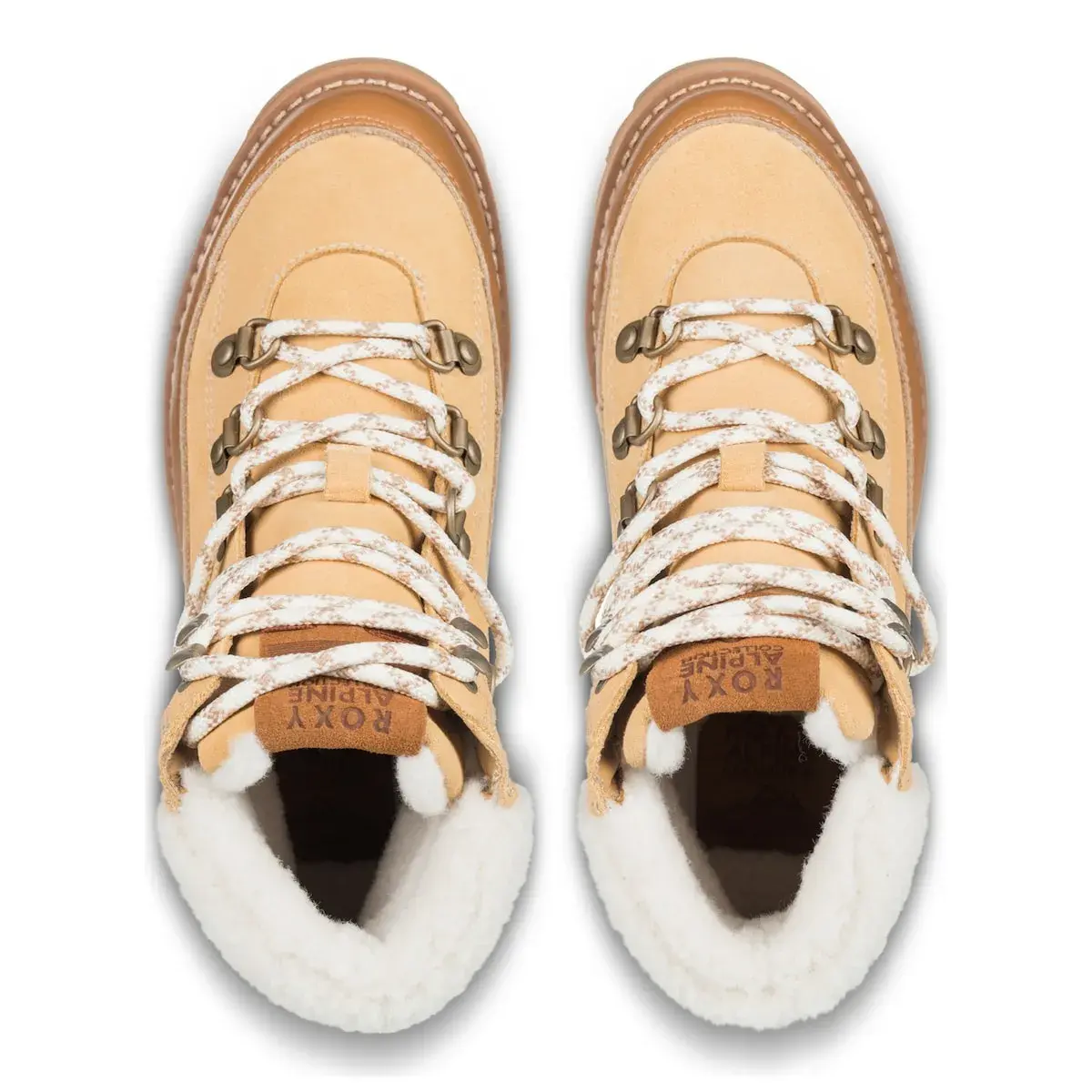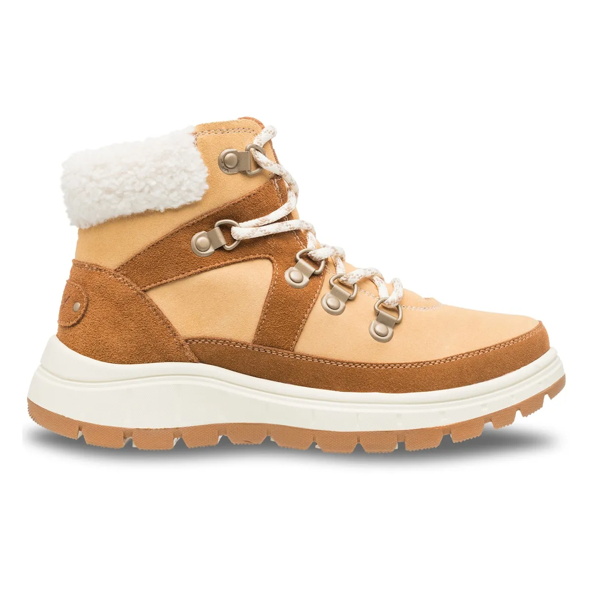 Вулканизированные женские ботинки. Характеристики включают: Климатический рейтинг: Roxy WarmFlight 3 с 200 г термоизоляции, климатический индекс до -40°C, Верхняя часть: замша с водоотталкивающей обработкой, материалы обработаны Scotchgard, Детали верхней части: шнурки с металлическими люверсами и D-образными кольцами, усиленный язычок, голенище из шерпы, Застежка: шнуровка в стиле походных ботинок, Стелька: внутренний слой из шерпы и стелька с маркировкой Roxy, Подошва: резиновая cupsole с рельефом Roxy в форме гор и мягкая стелька из TPE, Упаковка: коробка, Высота каблука: 40 мм.