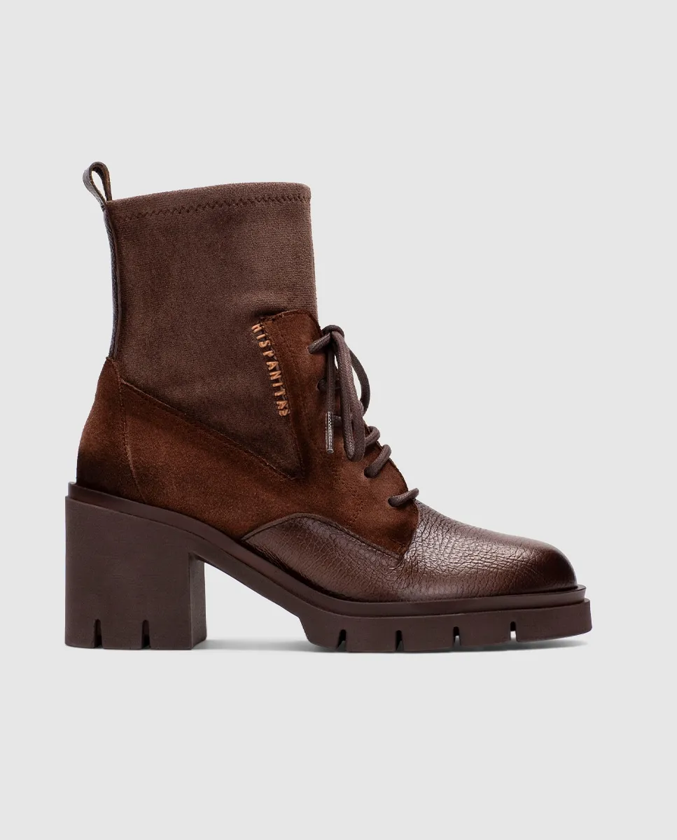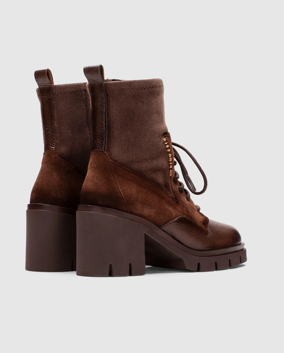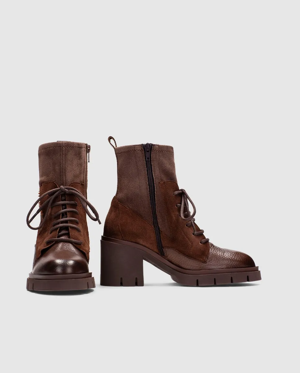 Ботинок с шнуровкой и подошвой track. Боковая молния для удобства надевания. Каблук 7 см. Выполнен из кожи в сочетании с эластичной тканью.