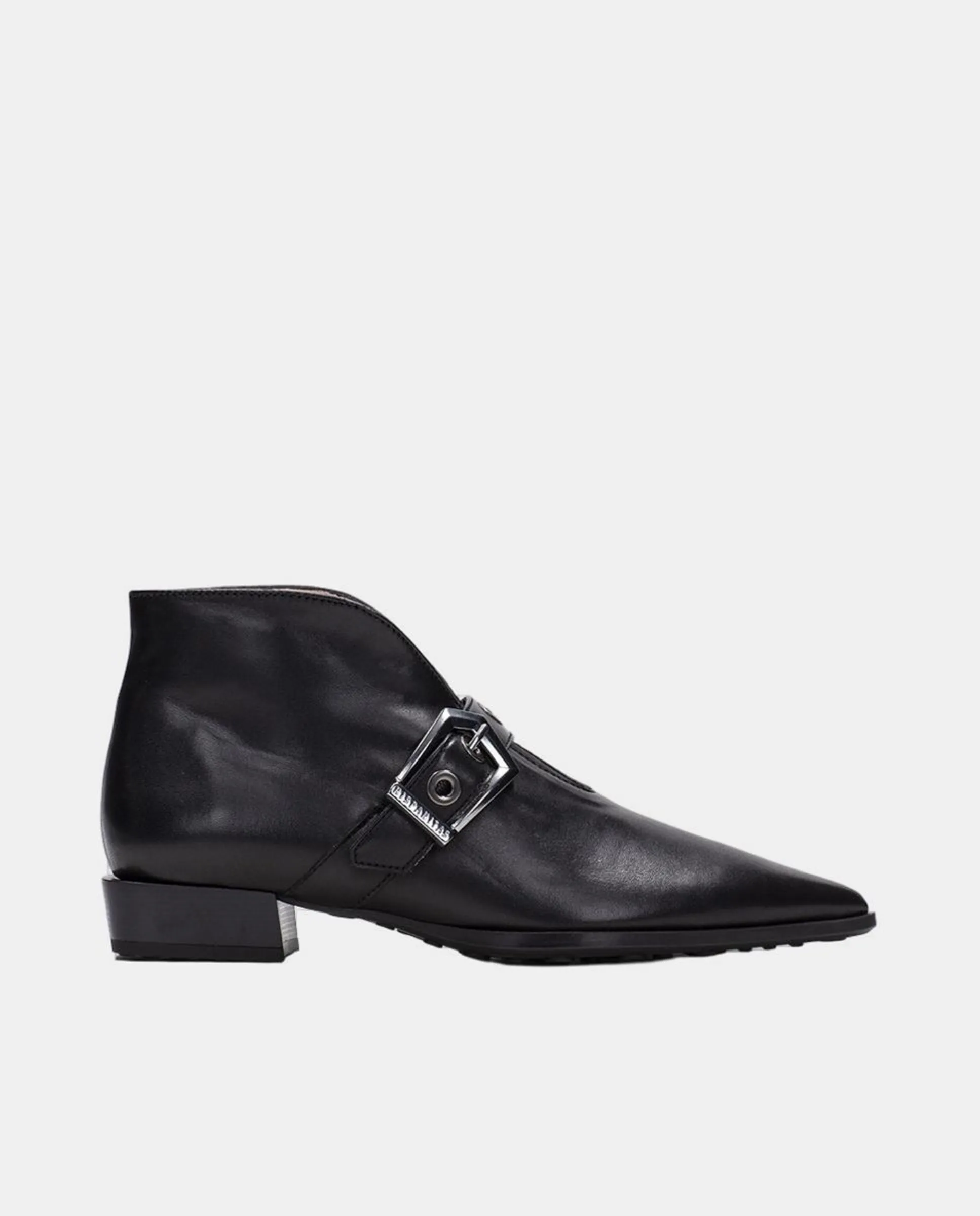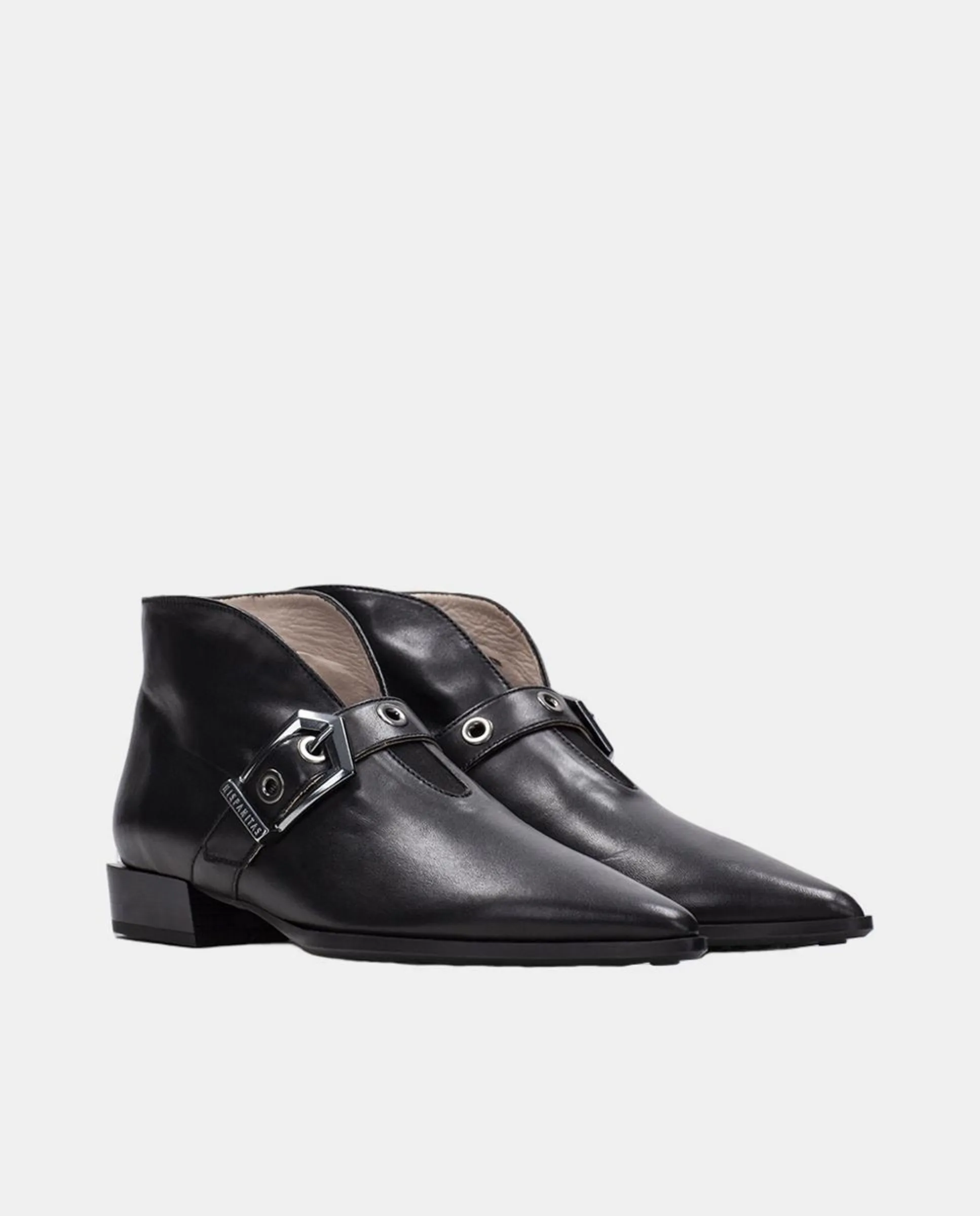 Повседневные ботинки с заостренным носком, с крупной пряжкой и люверсами на верхней части. Эластичная вставка по центру облегчает надевание. Подошва с эффектом резины с рисунком протектора и каблук 2,5 см. Изготовлены из кожи. Внутренняя отделка из кожи. Технология Triflow: тройная амортизирующая подкладка в области стопы, которая поглощает удары и обеспечивает эффект мягкости при ходьбе. Подходят к любому образу. Идут везде.