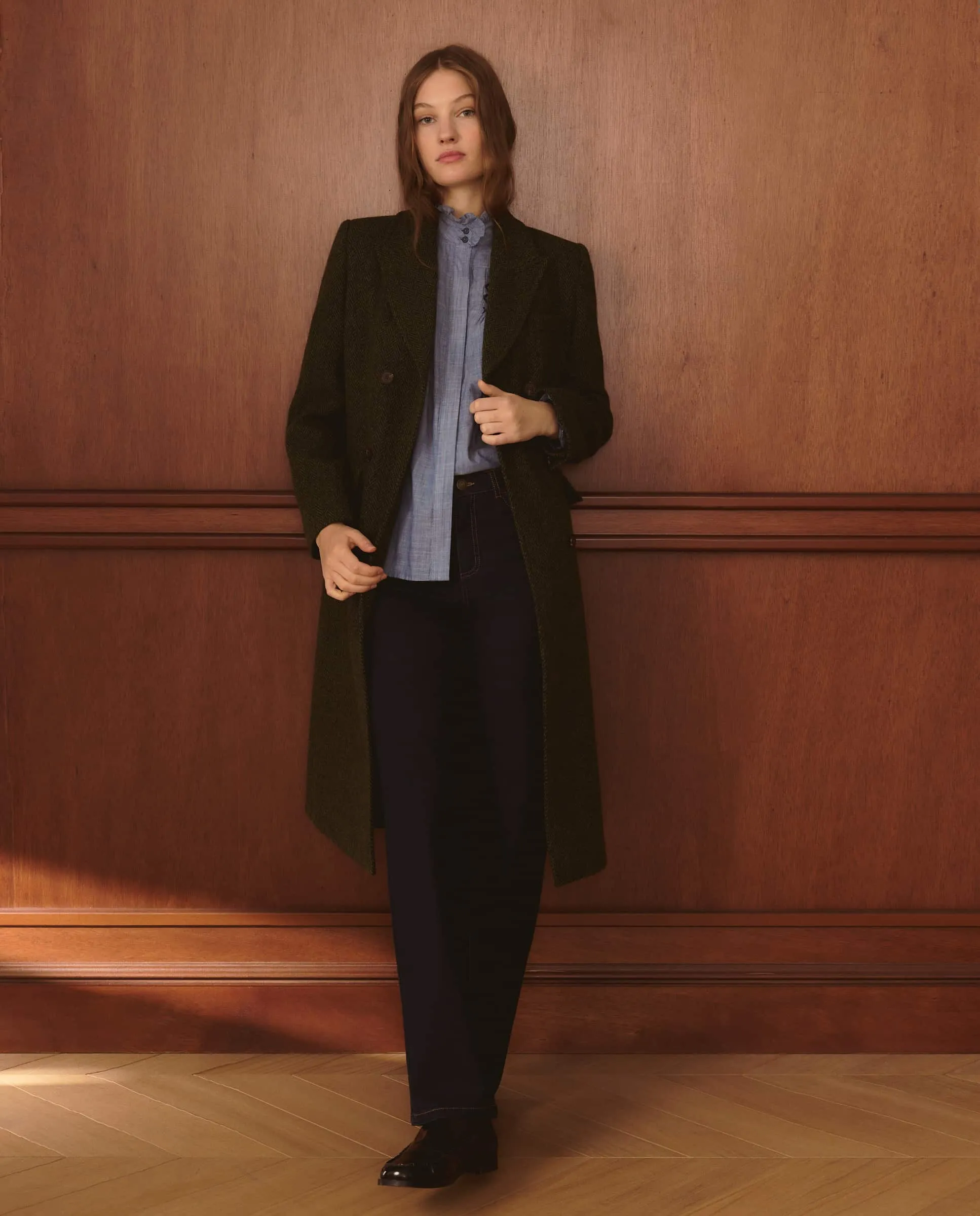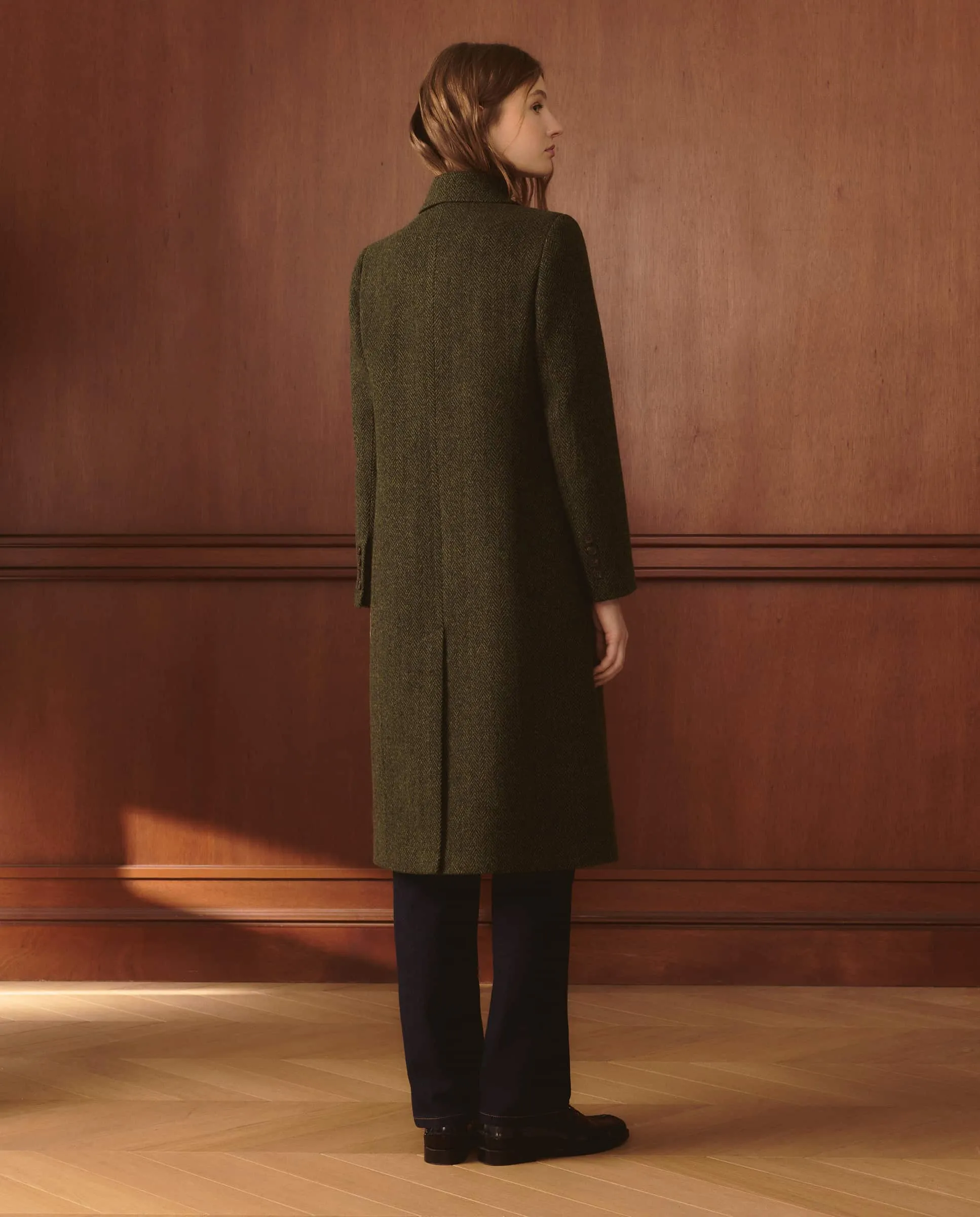Длинное шерстяное пальто с деталью в виде елочки.
