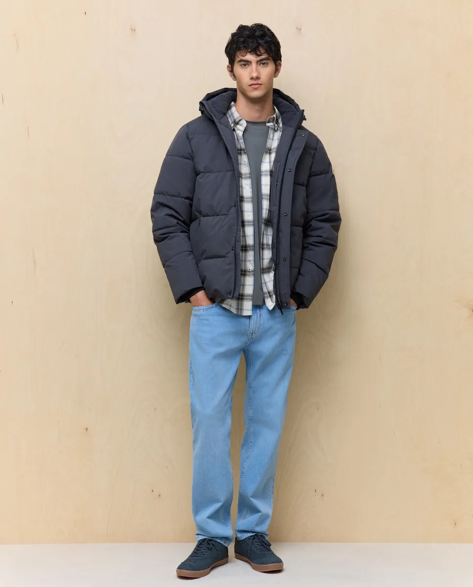 Мужской толстый пуховик с капюшоном, водоотталкивающий. Имеет три внешних кармана и один внутренний. Тянущаяся ткань для большей комфортности изделия.