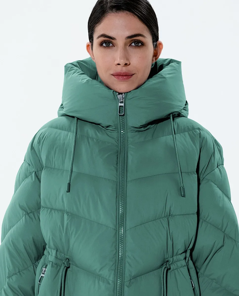 Ультралегкий пуховик оверсайз с наполнителем из пуха. Передняя молния с двумя бегунками и боковые карманы. Водоотталкивающий материал и отличная термоизоляция. Можно стянуть на талии.