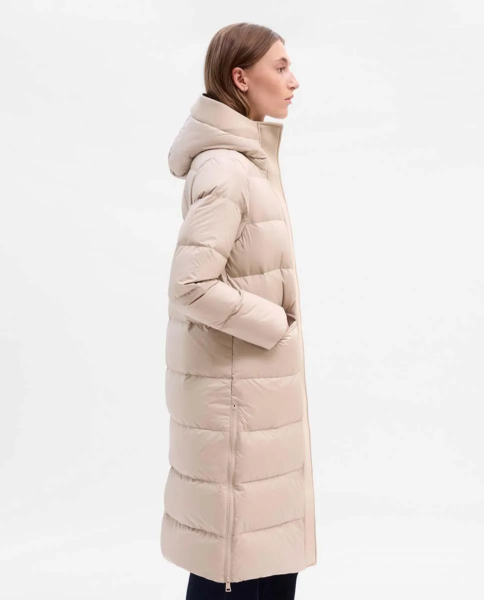 Длинная стеганая парка с капюшоном. Детали из ткани типа скуба. Наполнитель из пуха. Застежка-молния. Карманы на молнии по шву и на груди. Боковые разрезы на молнии.