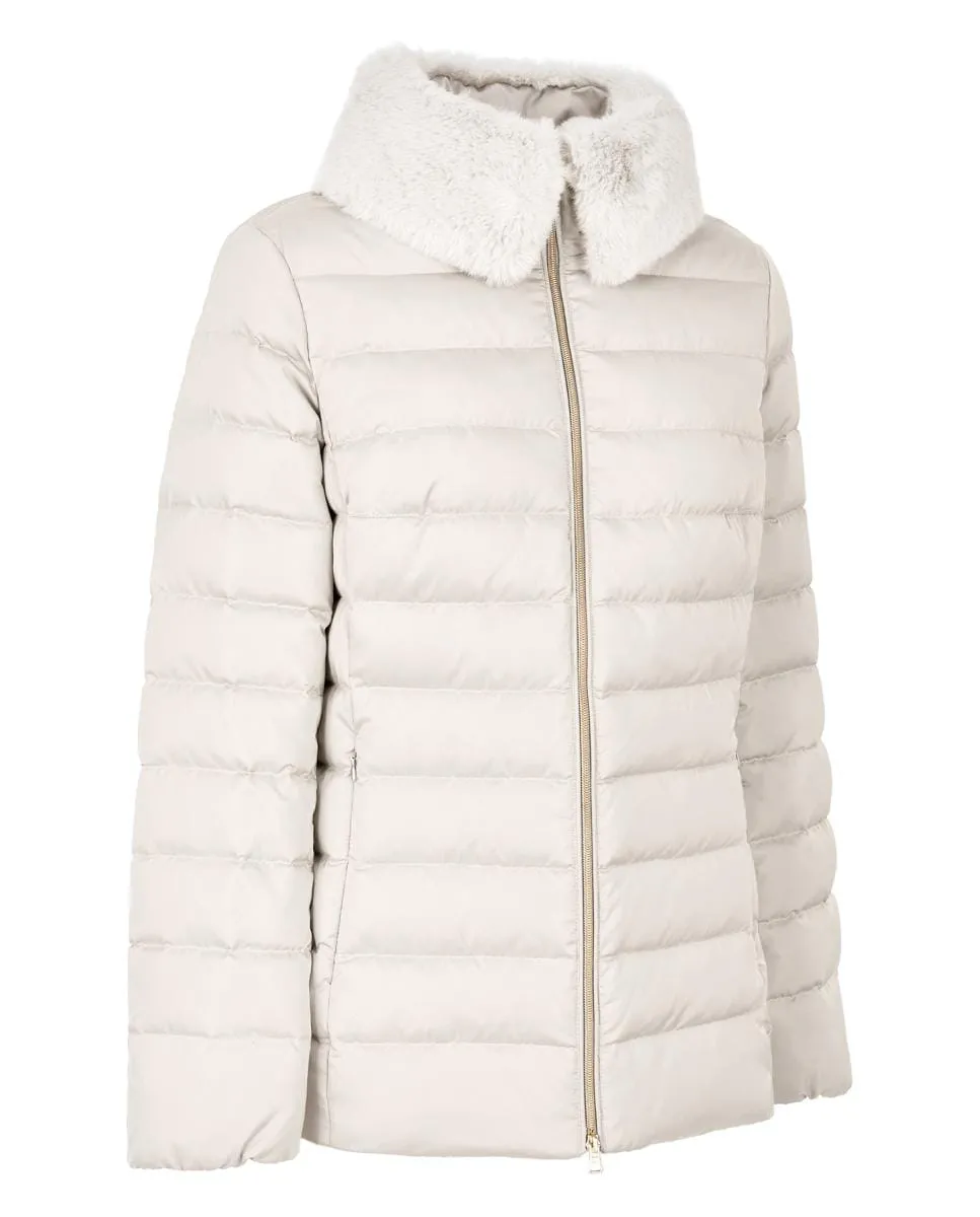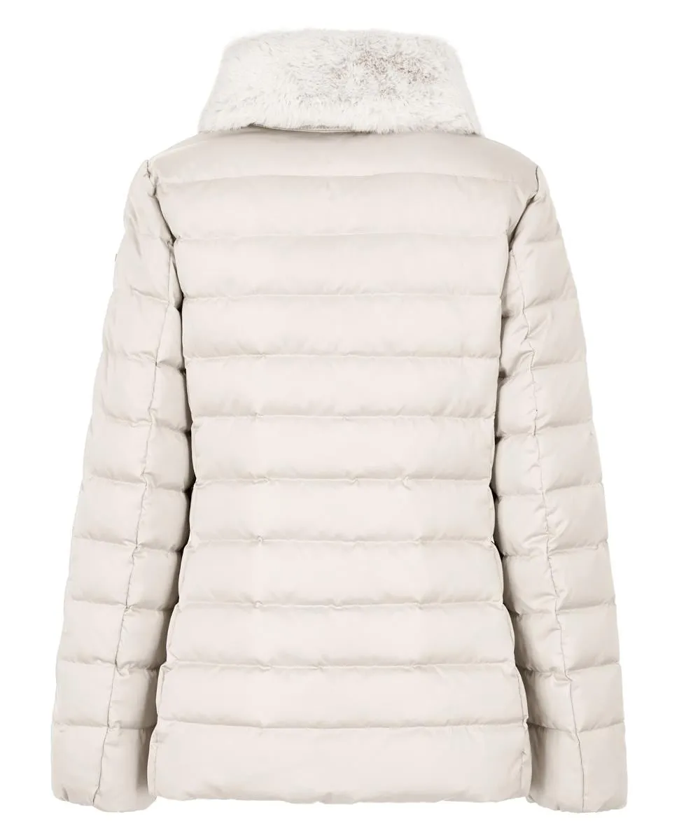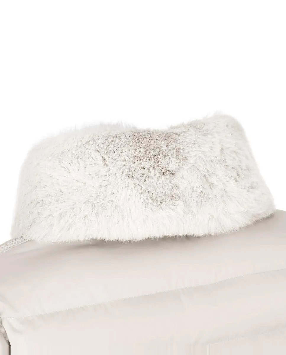 Bettanie - это женский пуховик длиной до бедер, который обрамляет силуэт женственными линиями. Эта модель, выполненная из сатиновой ткани с переработанным наполнителем и отделкой из меха на воротнике, стильно защищает в городские дни.