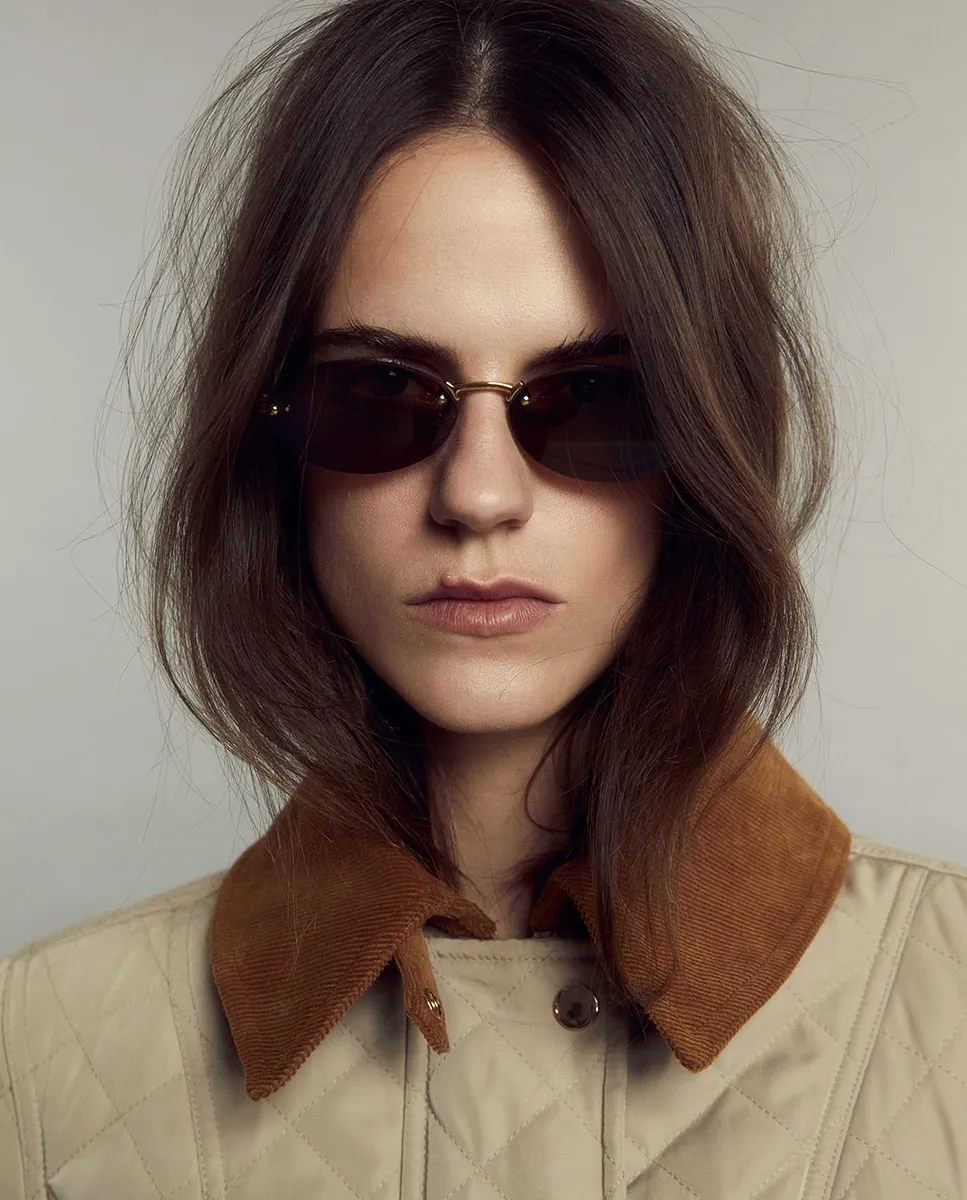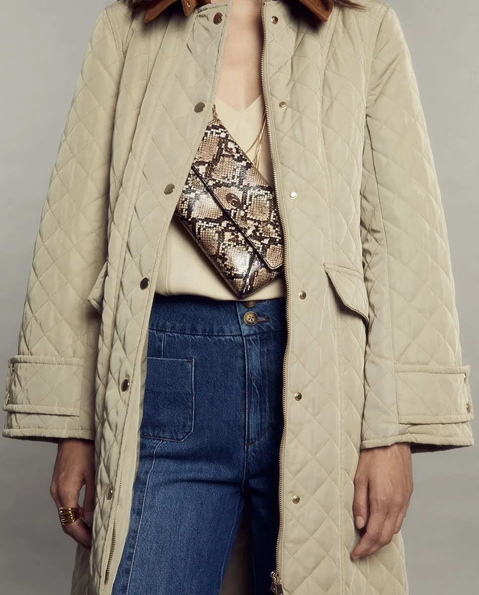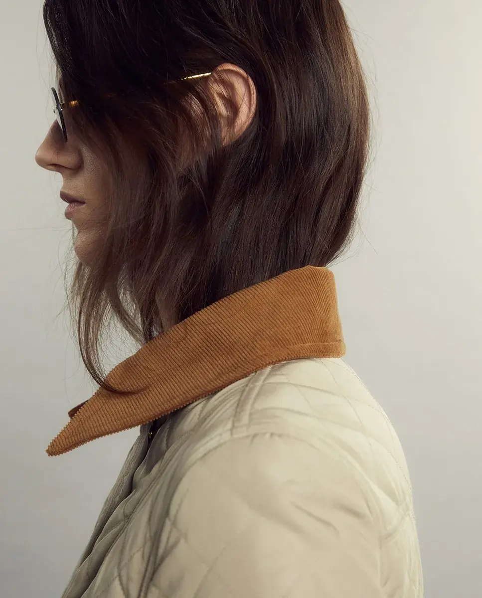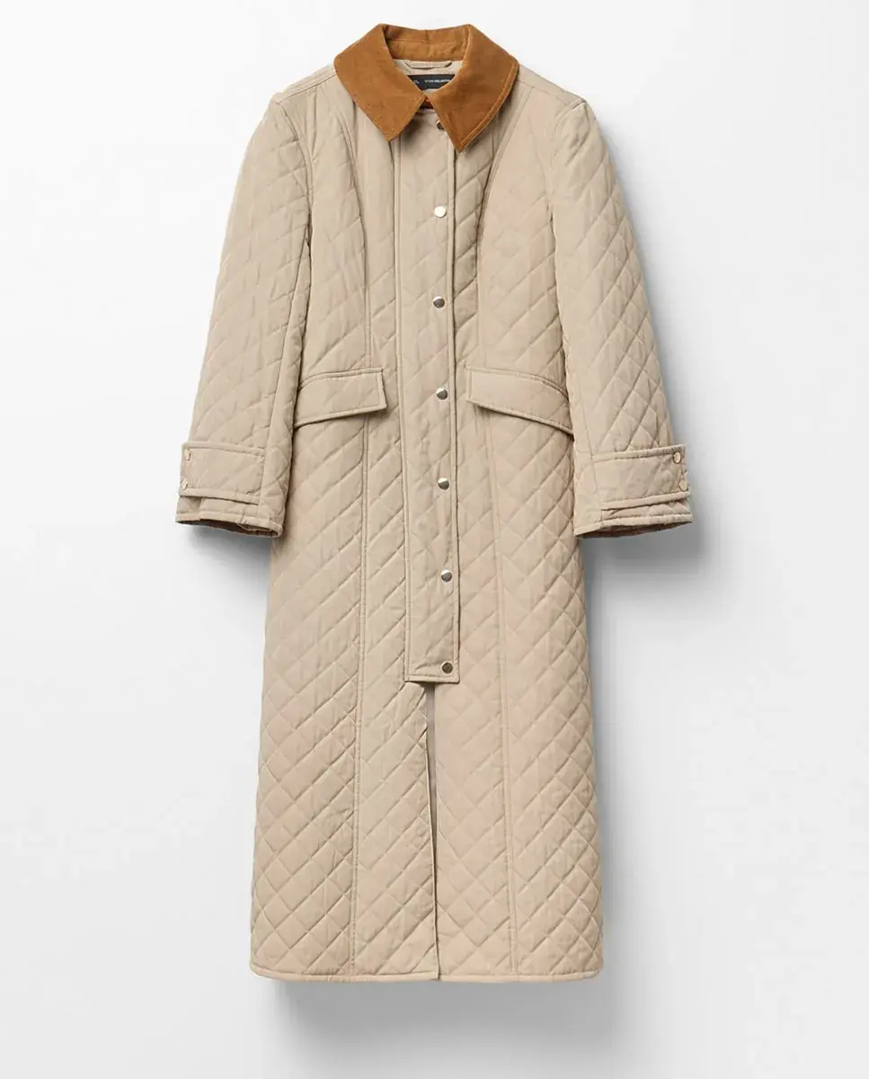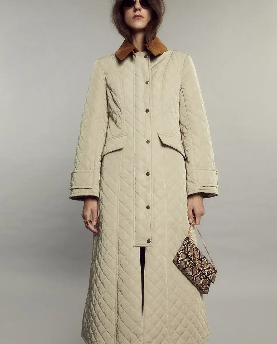 Длинное стеганое пальто с рубашечным воротником из вельвета. Передняя застежка на крючки и молнию, скрытую под планкой.