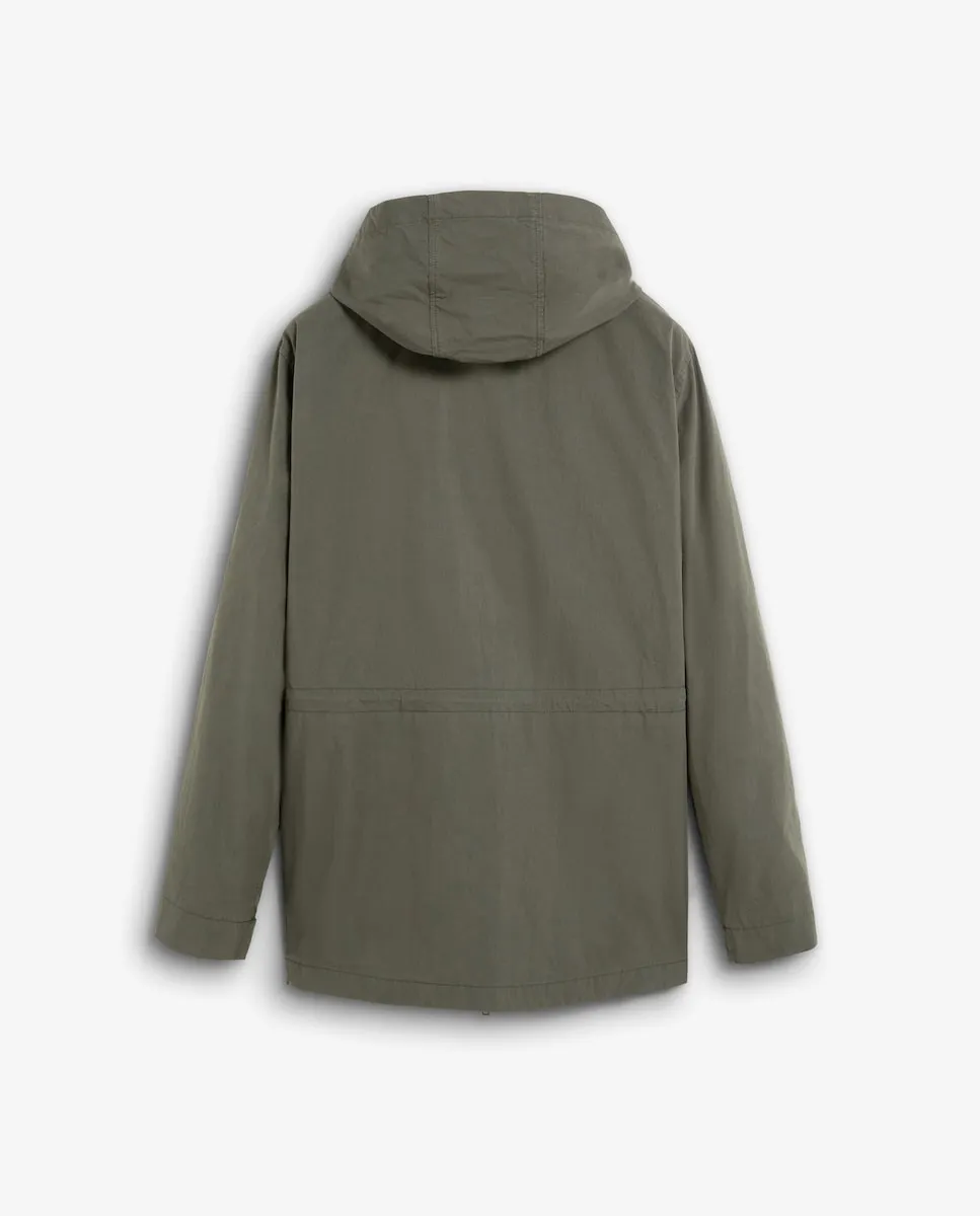 Парка, изготовленная преимущественно из хлопка. Капюшон с регулируемой застежкой. Четыре передних кармана с клапанами. Передняя застежка на молнию, скрытую клапаном и кнопками. Длинные рукава с регулируемыми манжетами. Прямой низ.