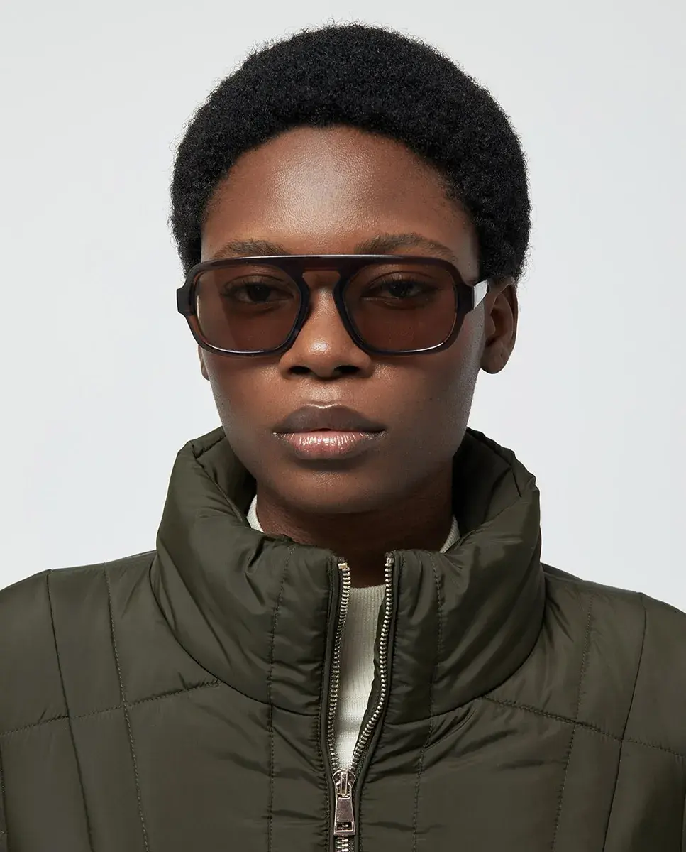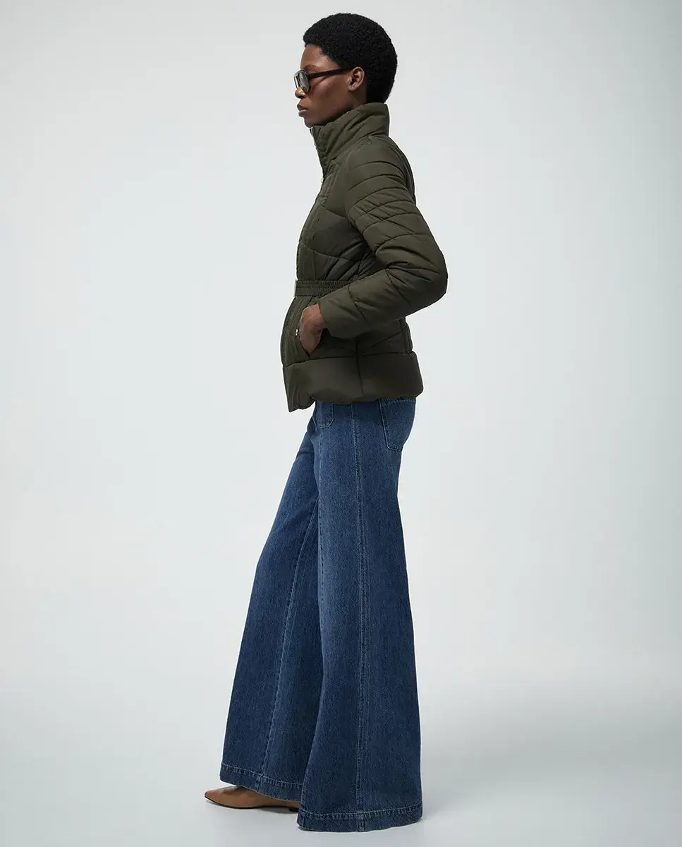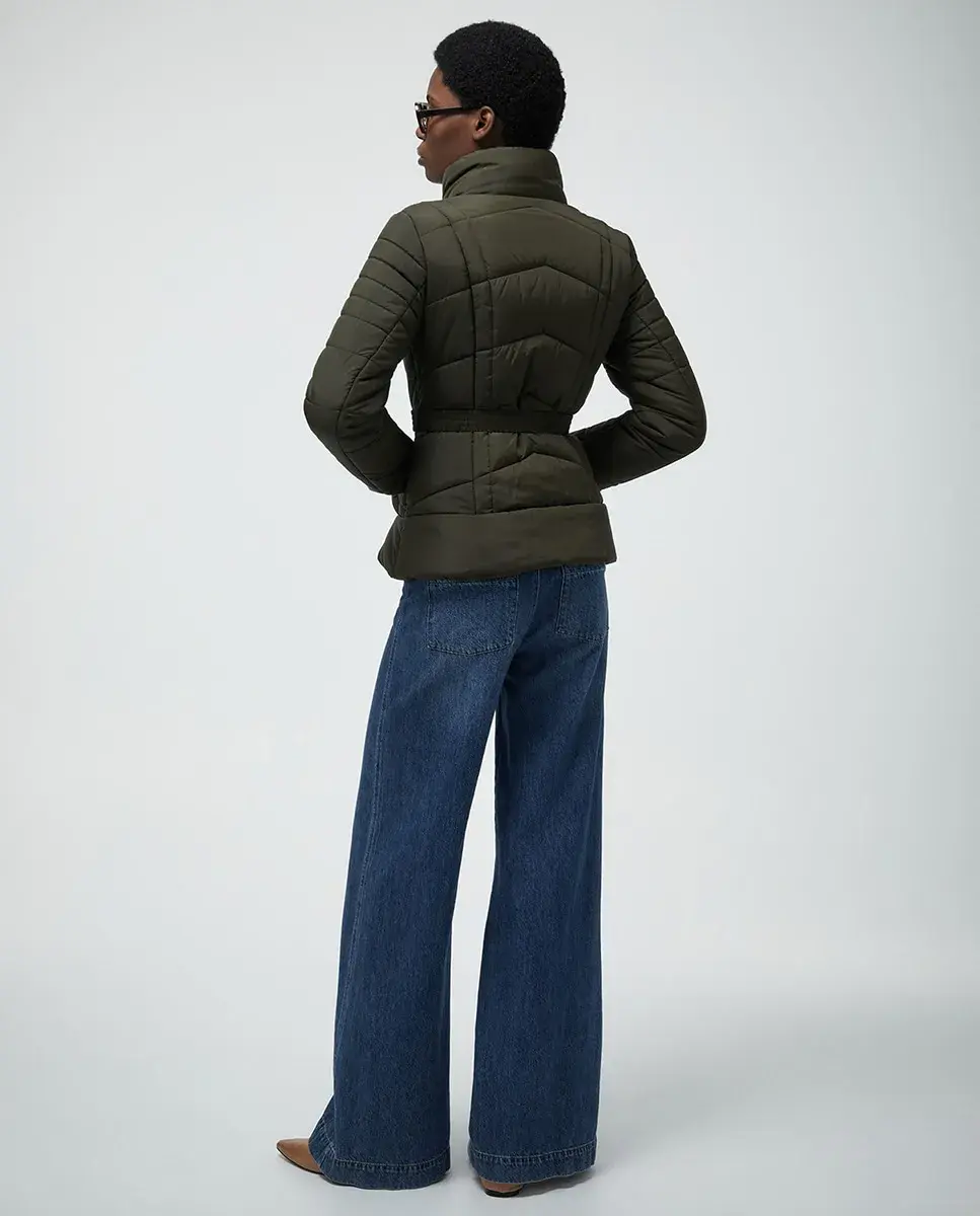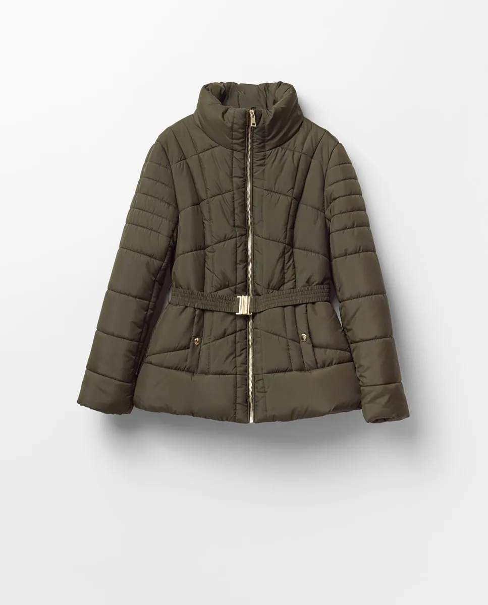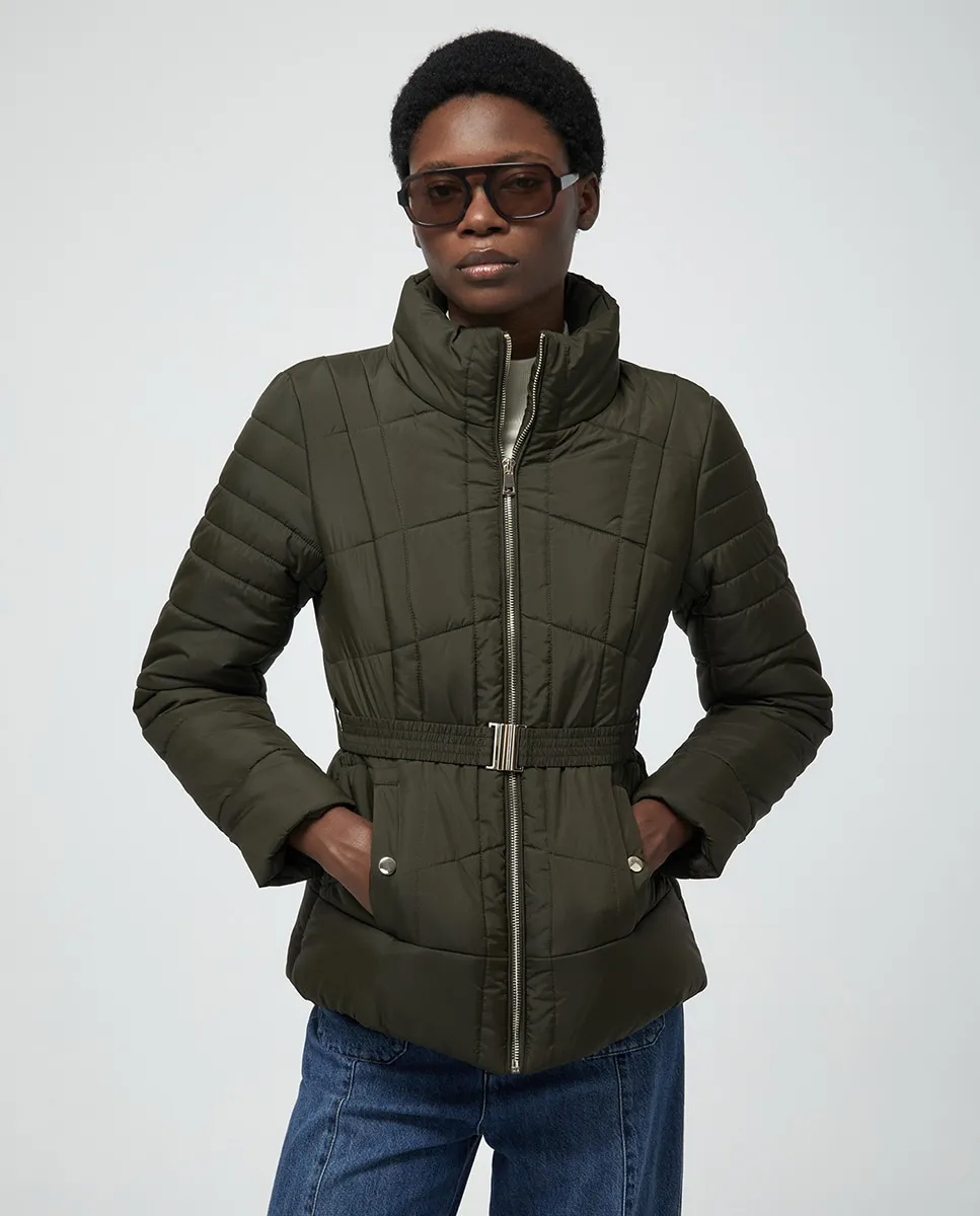Стеганая парка с воротником-стойкой и поясом. Застежка на молнию и карманы