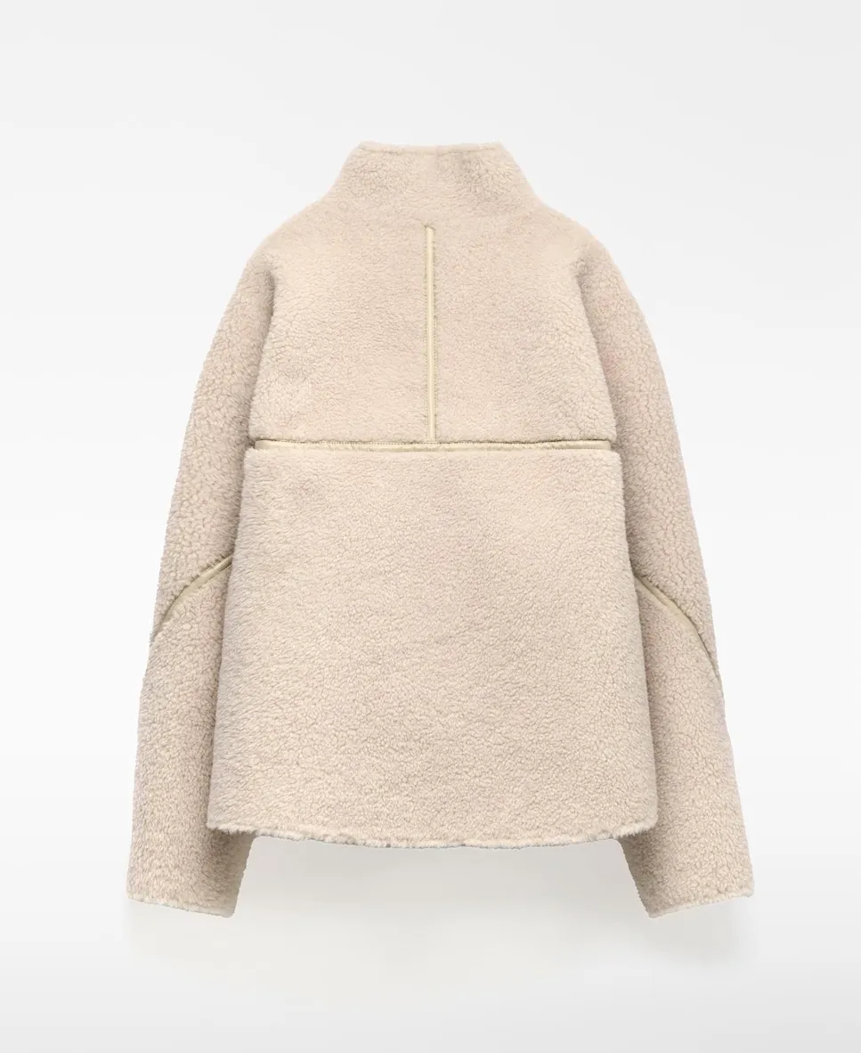 Двухсторонняя куртка из искусственной овчины с закругленной линией. Внутренняя часть и вставки на рукавах и спине выполнены из кожзаменителя. Имеет высокий воротник с застежкой на две пуговицы, перед с перекрестной застежкой на пуговицы и наклонные прорезные карманы спереди.