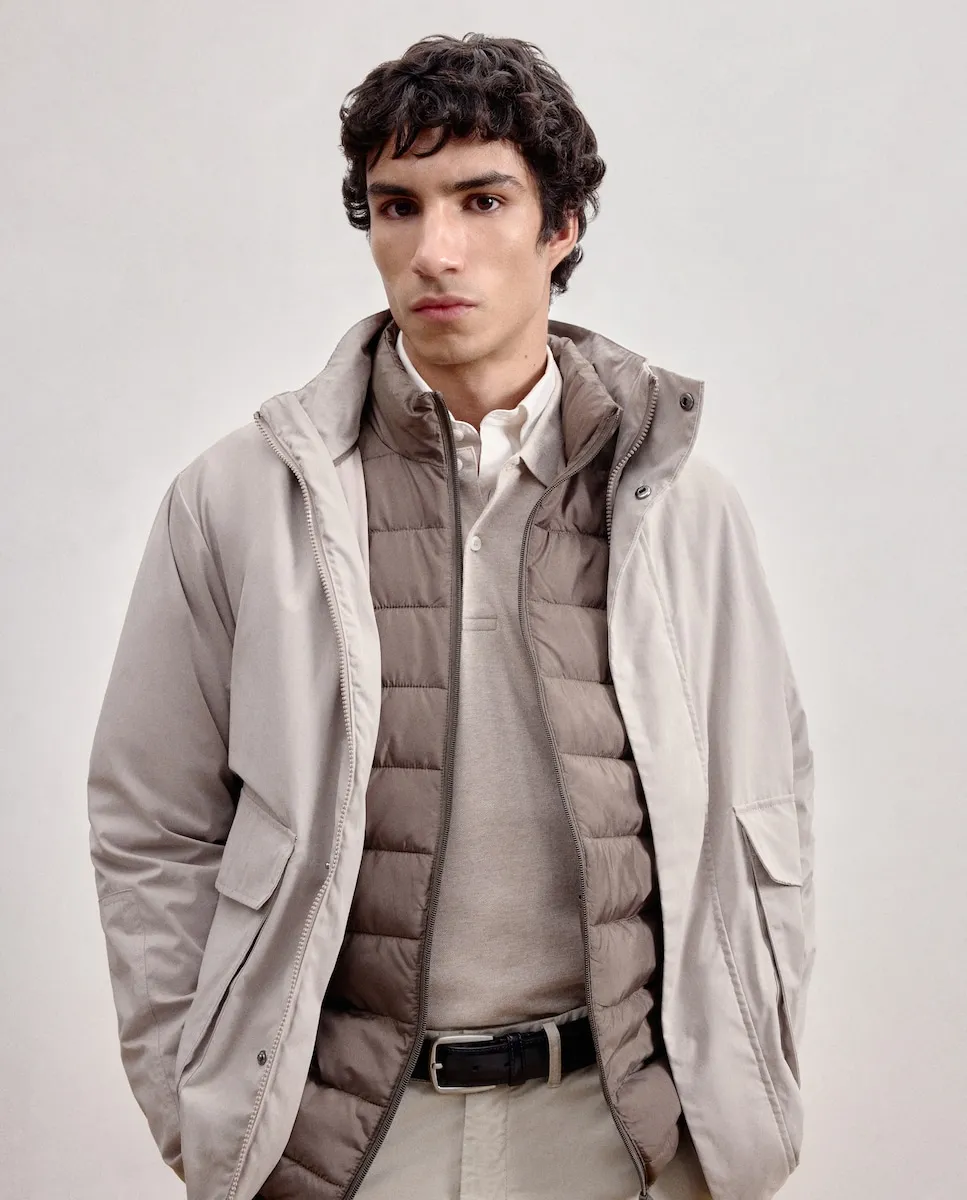 Мужская парка с капюшоном, наружными накладными карманами и водоотталкивающей тканью. Полный внутренний жилет, который можно носить отдельно или с паркой.