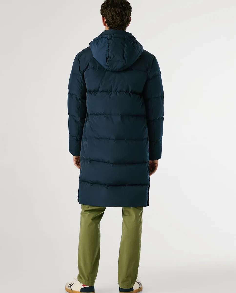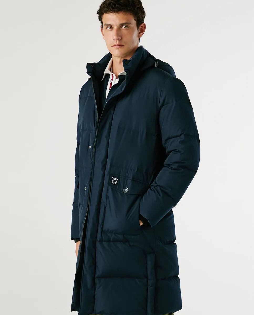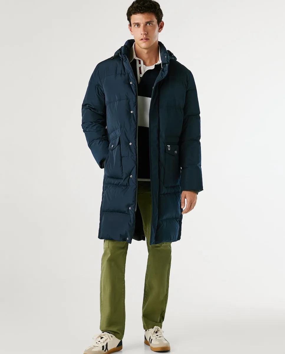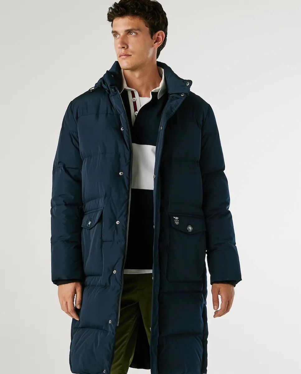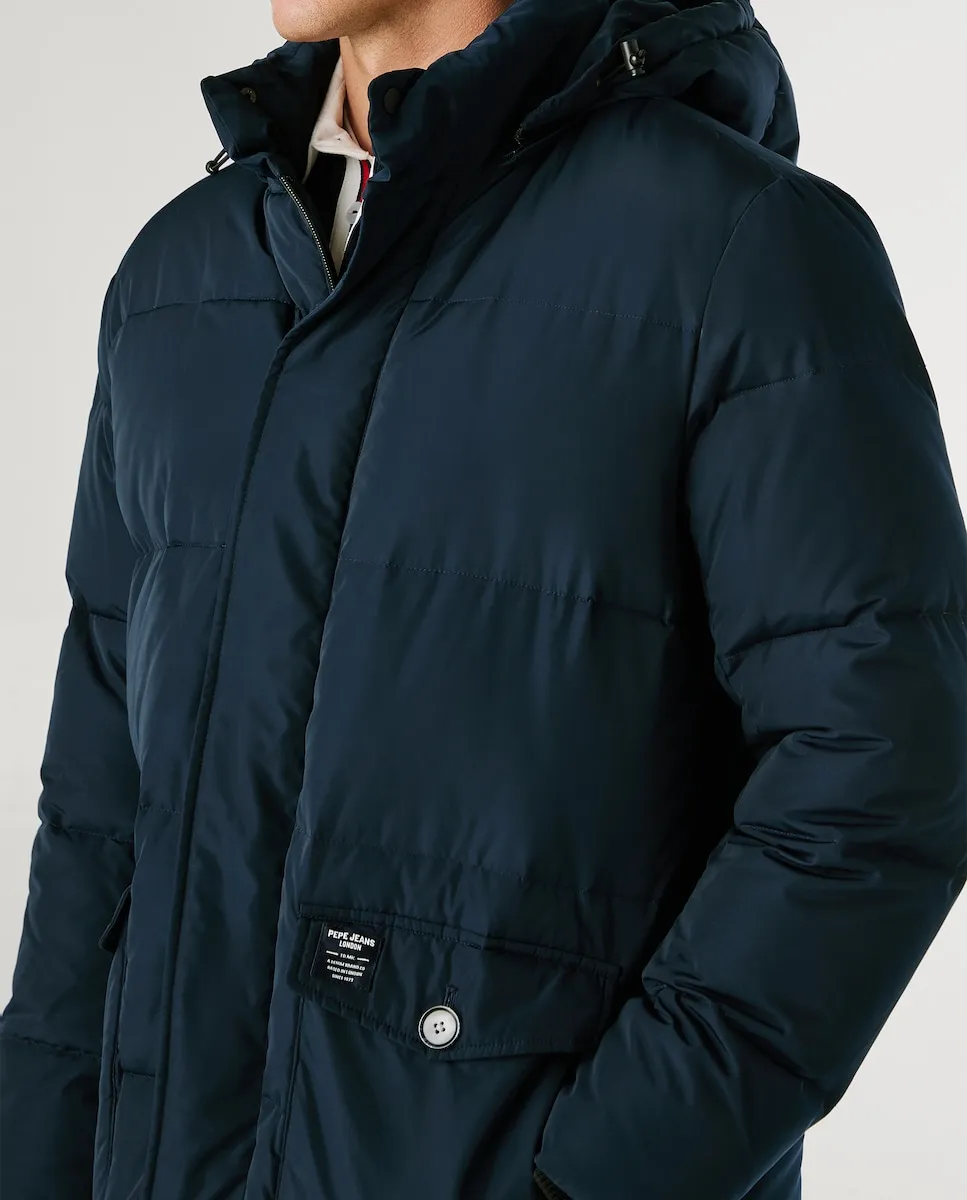 Длинная парка из легкой ткани с утепленными вставками, наполненными натуральным пухом, высокий воротник с двумя кнопками и регулируемый капюшон с шнурками. Передняя застежка на молнии с планкой, скрывающейся под кнопками, боковые карманы с клапанами и кнопками, этикетка с логотипом PEPE JEANS на боковом кармане.