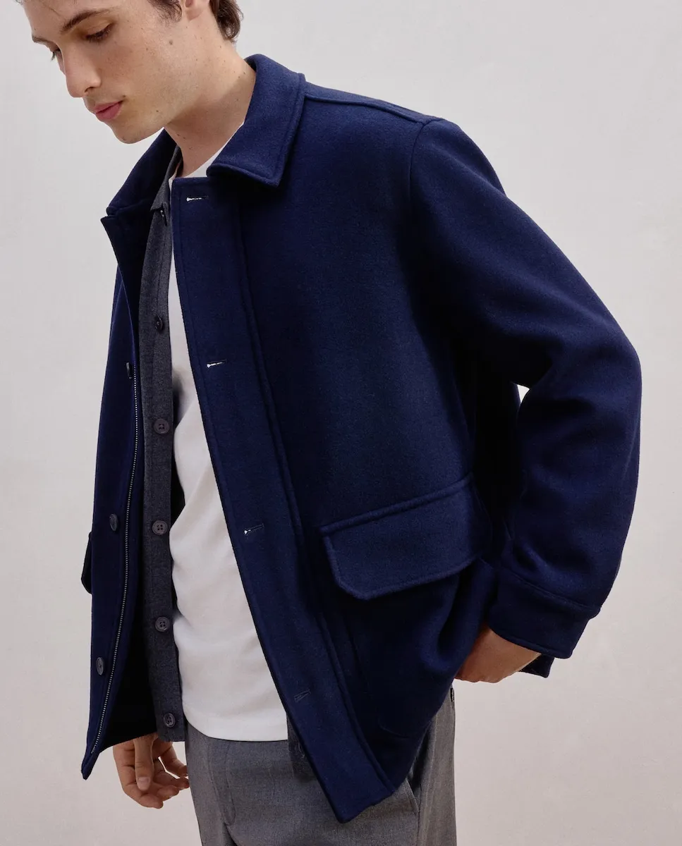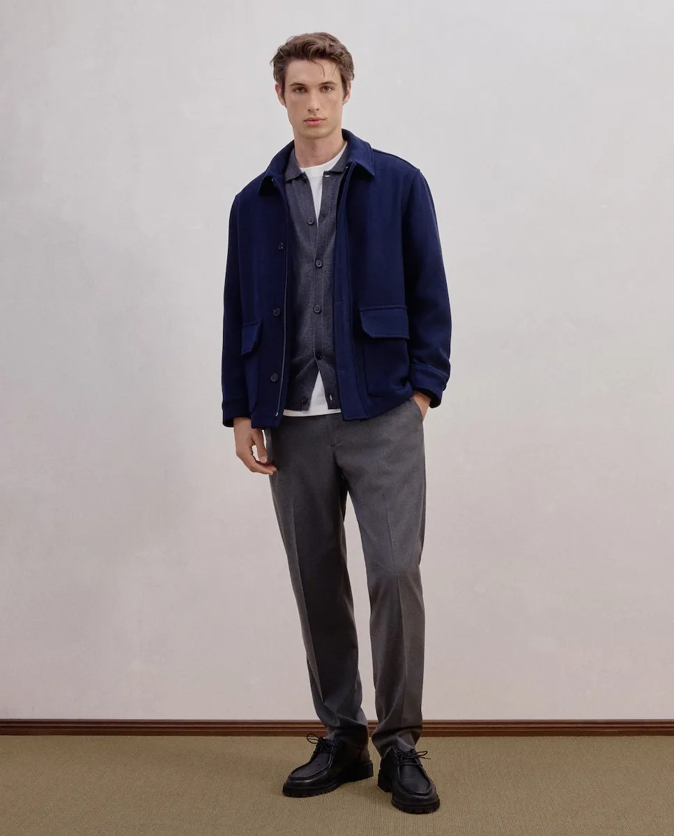Мужская шершавая куртка с рубашечным воротником, с кнопками, боковыми карманами и накладными карманами.