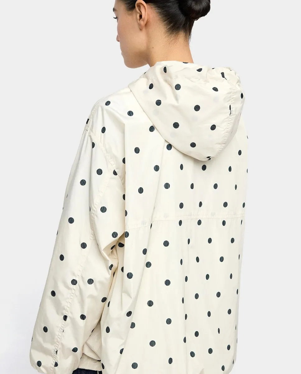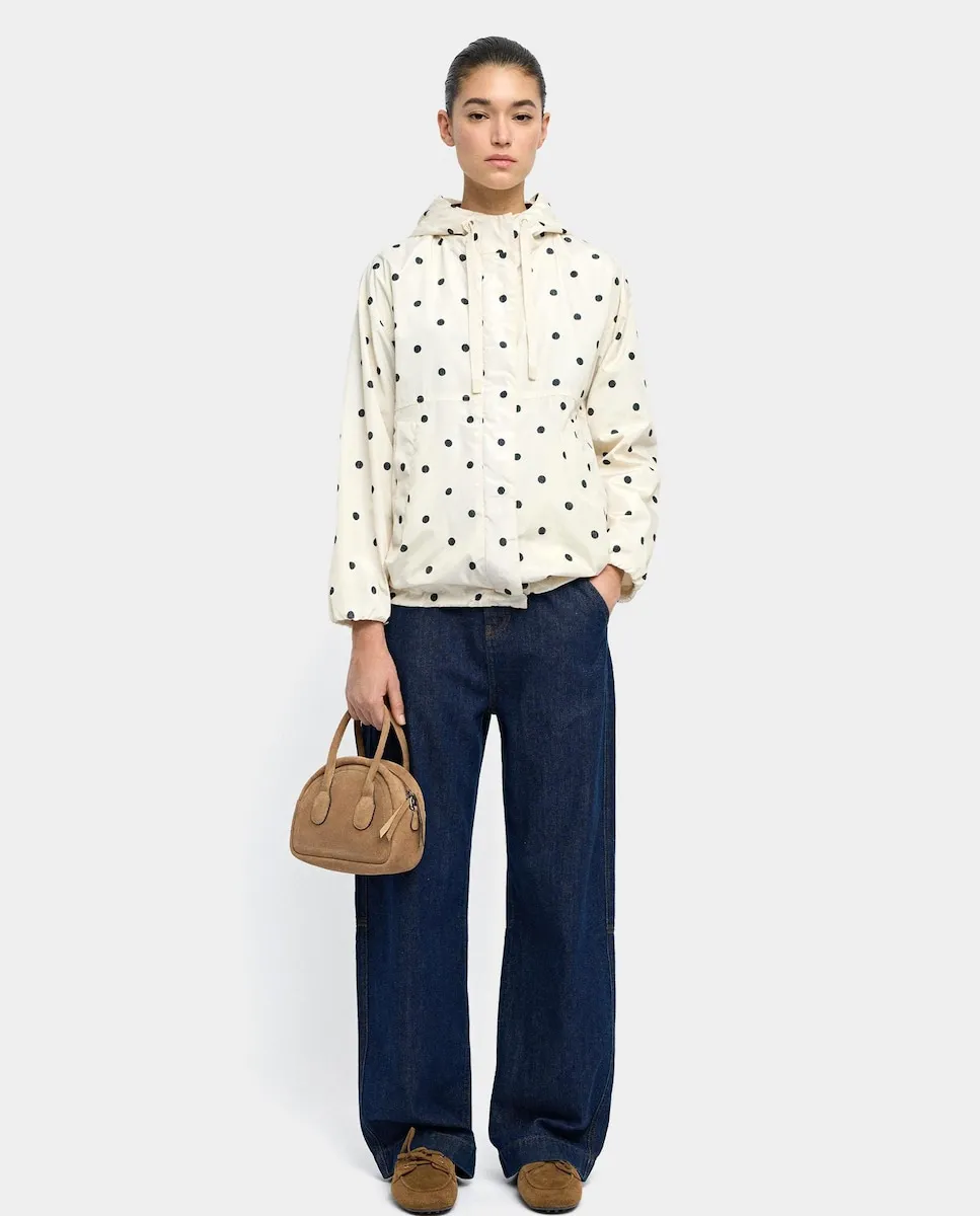 Парка в горошек. Круглый воротник и капюшон. Длинные рукава с эластичными манжетами. Застежка на молнию, скрытая под кнопками. Боковые карманы. Модель ростом 1,75 м, размер XS-S.
