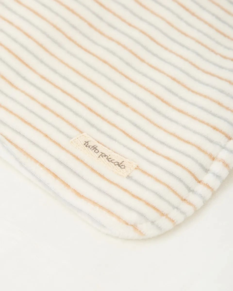Одеяло из белого распушенного материала с полосками в песочных и серых тонах, подкладка из гладкого и мягкого материала с наполнителем внутри.