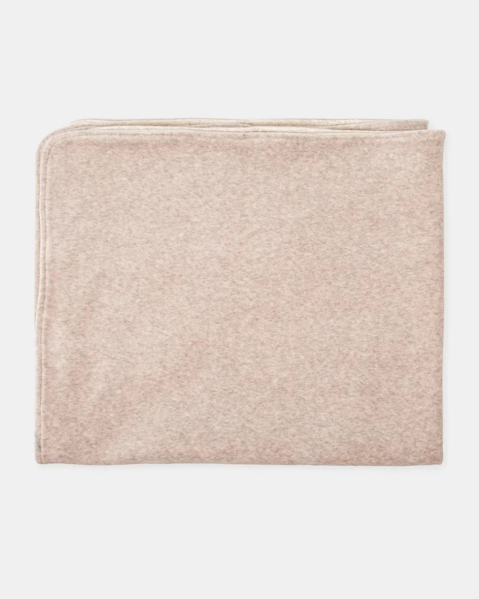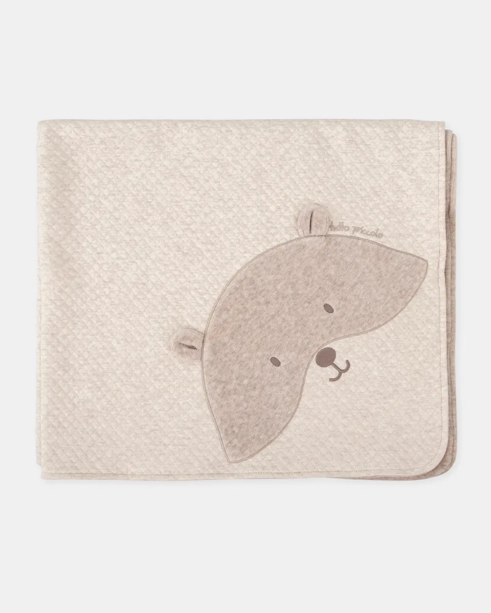 Покрывало из интерлока кремового цвета с эффектом стежки, с подкладкой из серого плюша. Деталь с вышитой медвежьей мордочкой.