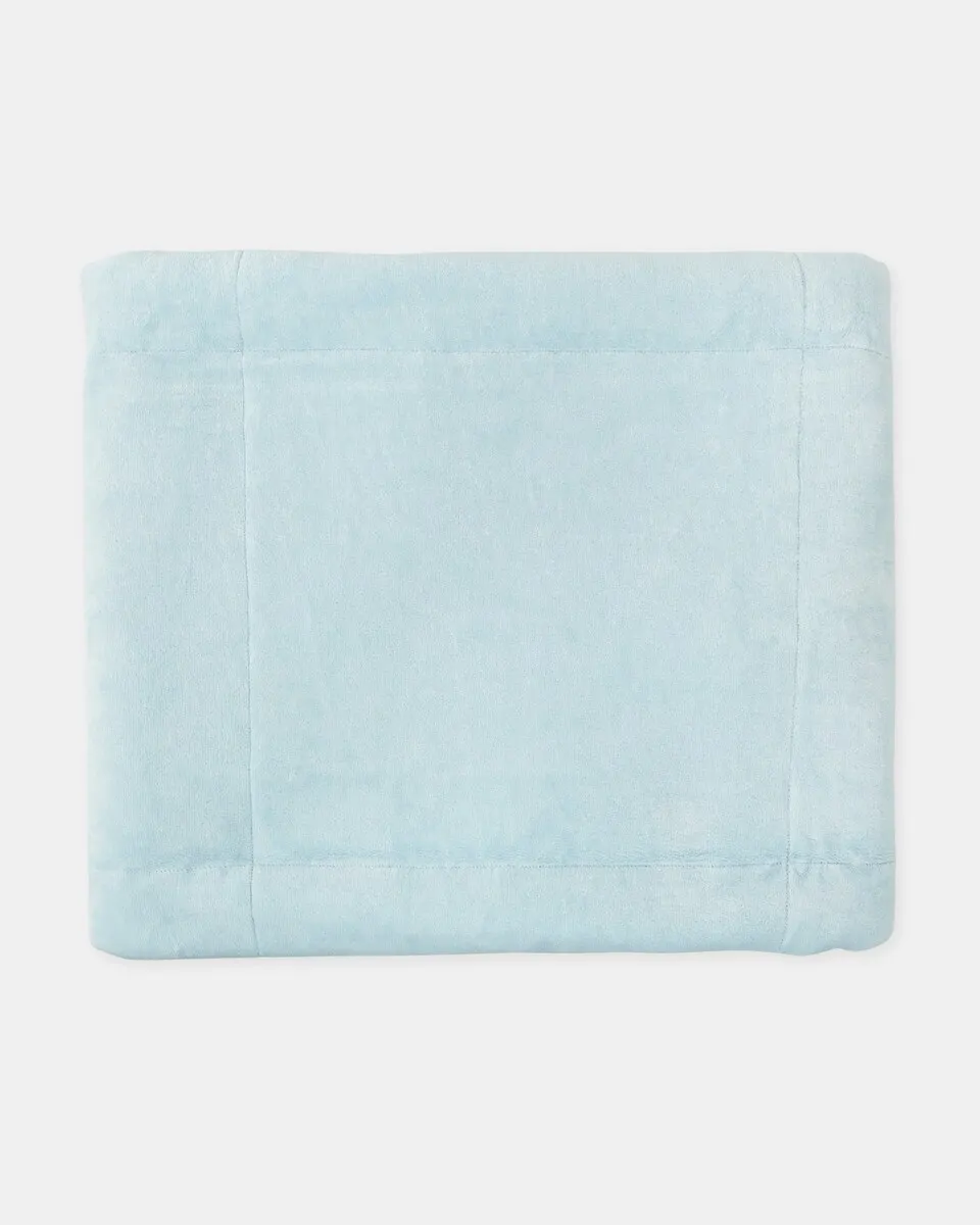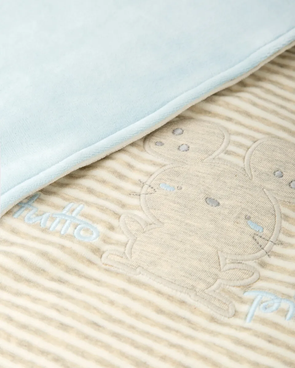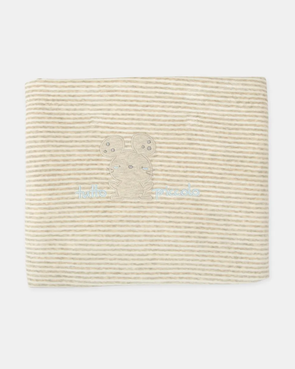 Плед с полосатым рисунком серого цвета с эффектом меланжа, комбинированный с однотонным. Внутри теплый стеганый слой. Деталь: вышитый мышонок с логотипом. Доступны два варианта цвета: синий и лепестковый.