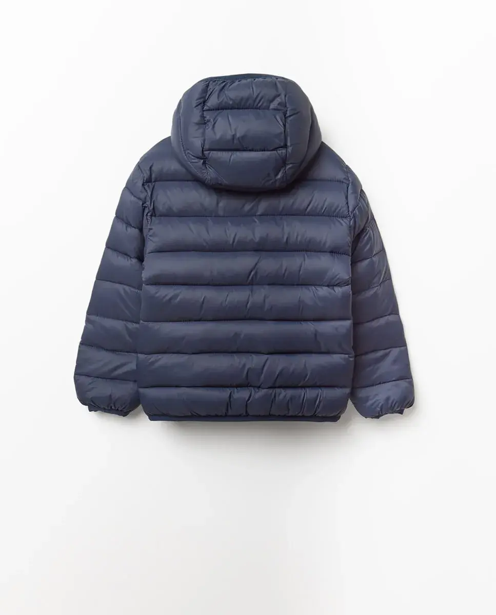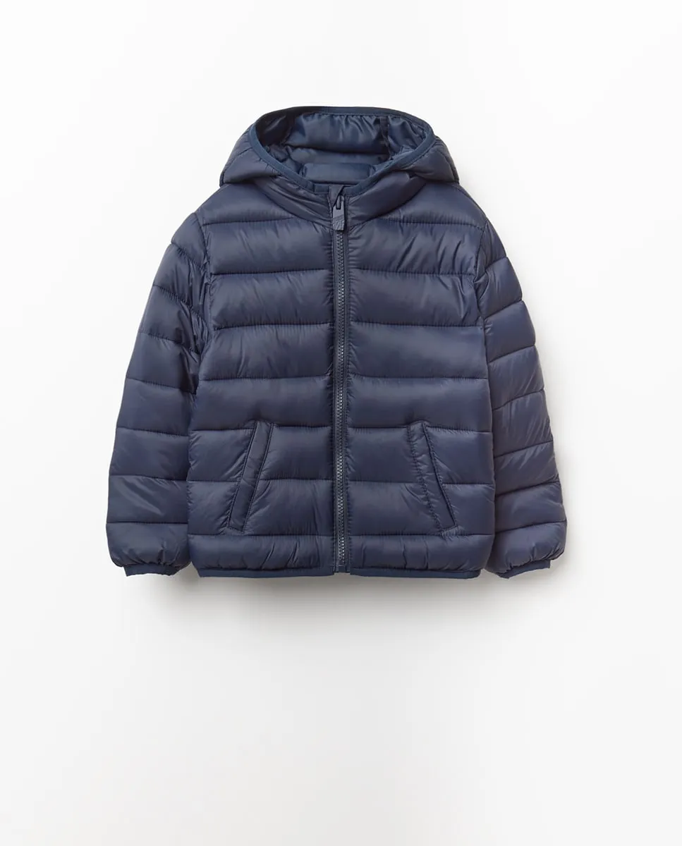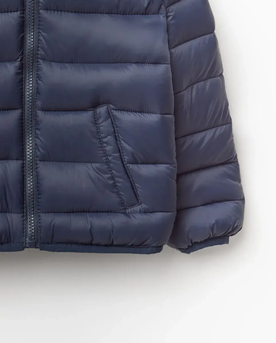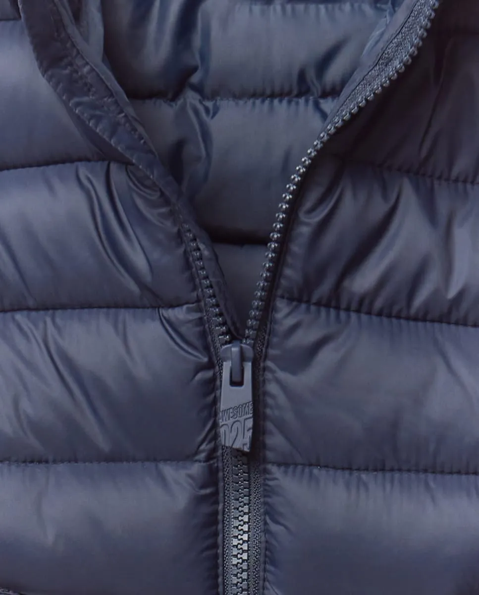 Легкое стеганое пальто с капюшоном и карманами. Застежка на молнию