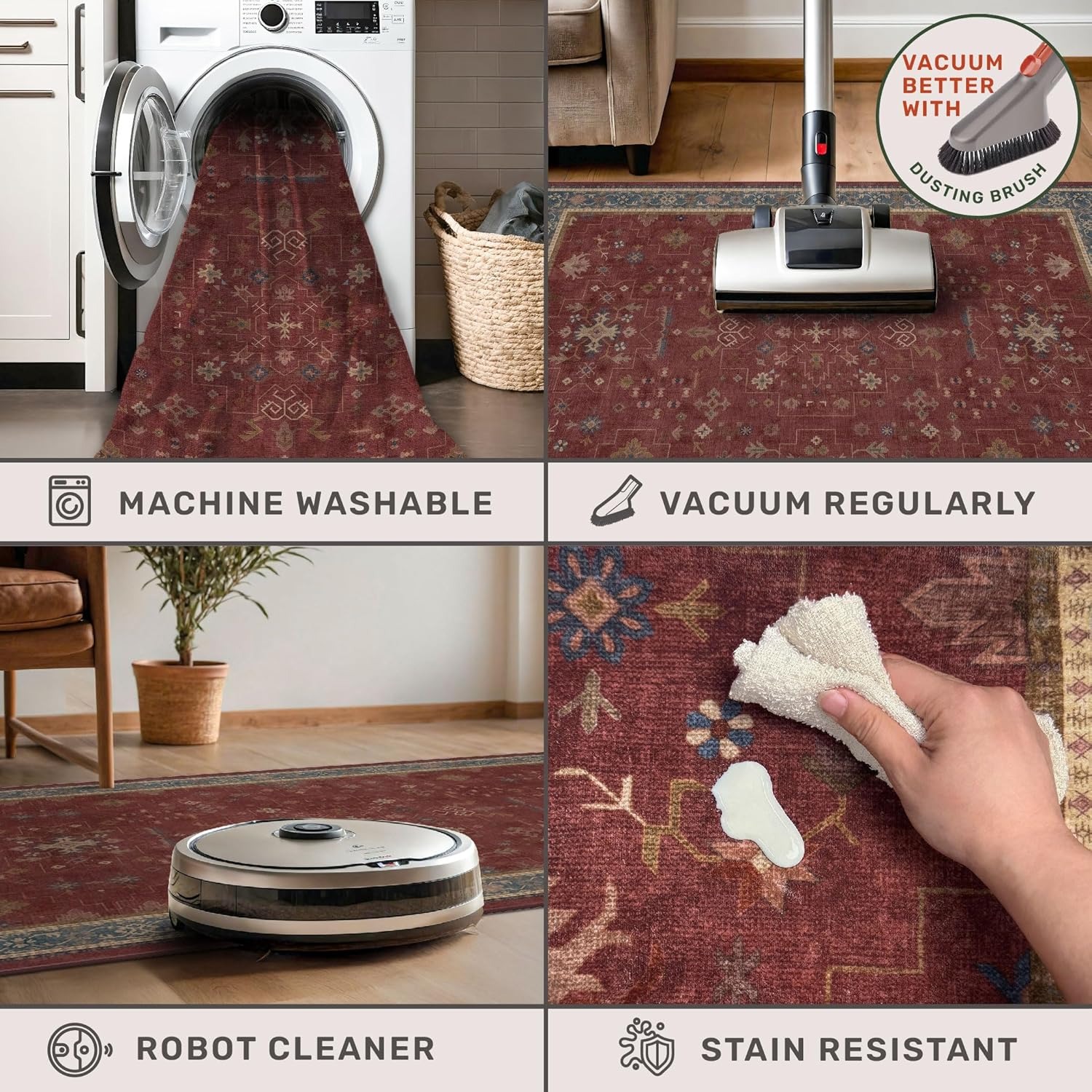 Коврик изготовлен из прочного моющегося материала, который легко очищается от повседневных загрязнений. Надежная нескользящая основа гарантирует безопасность даже на гладком кафельном полу. Благодаря влагостойким свойствам он отлично подходит для использования в зонах с повышенной проходимостью.