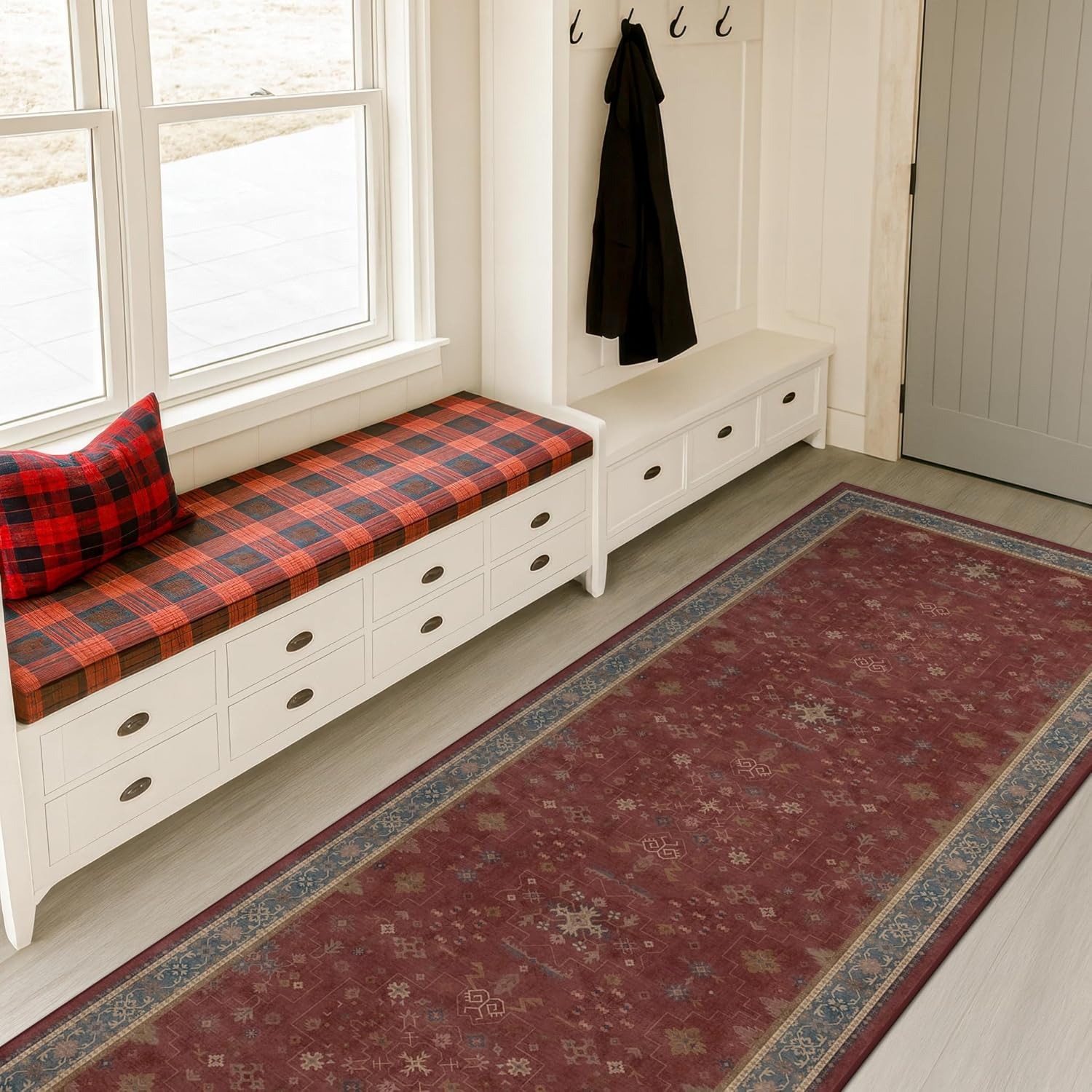 Коврик для прихожей 244×77 см сочетает в себе восточный шарм и современную практичность. Его удлиненная форма идеально подходит для просторных прихожих, коридоров или кухонных помещений. Изысканный турецкий цветочный орнамент в бордовых тонах добавляет интерьеру тепла и уюта, напоминая о традиционных коврах ручной работы.