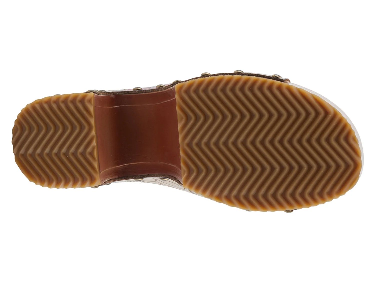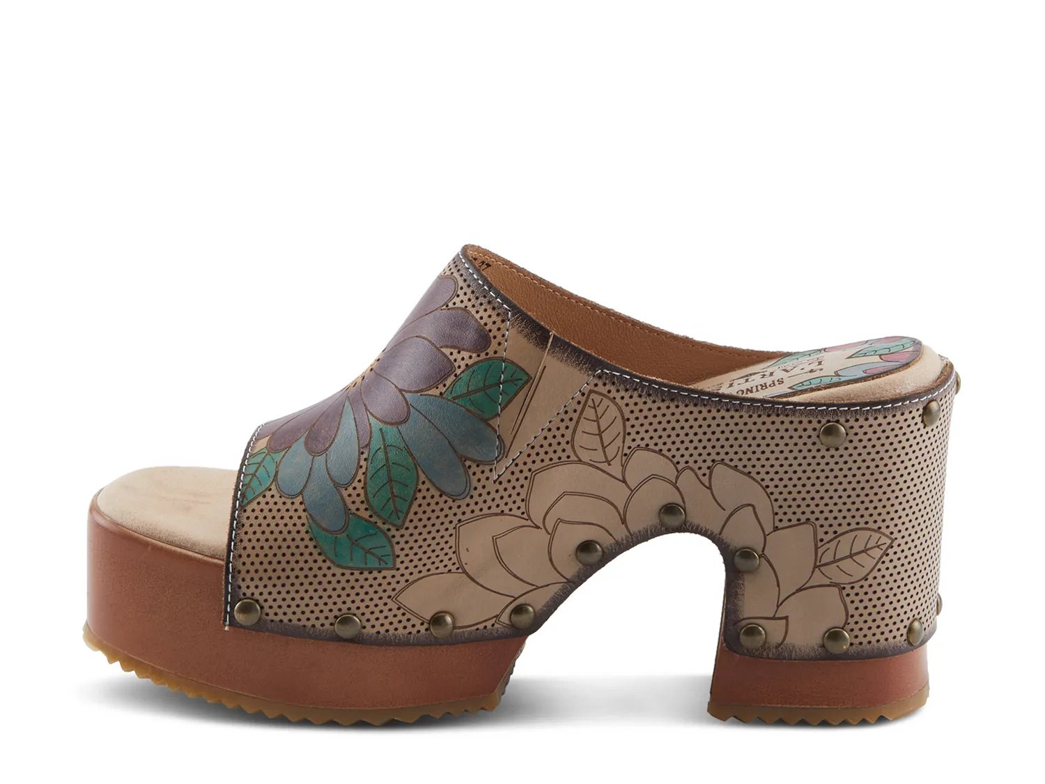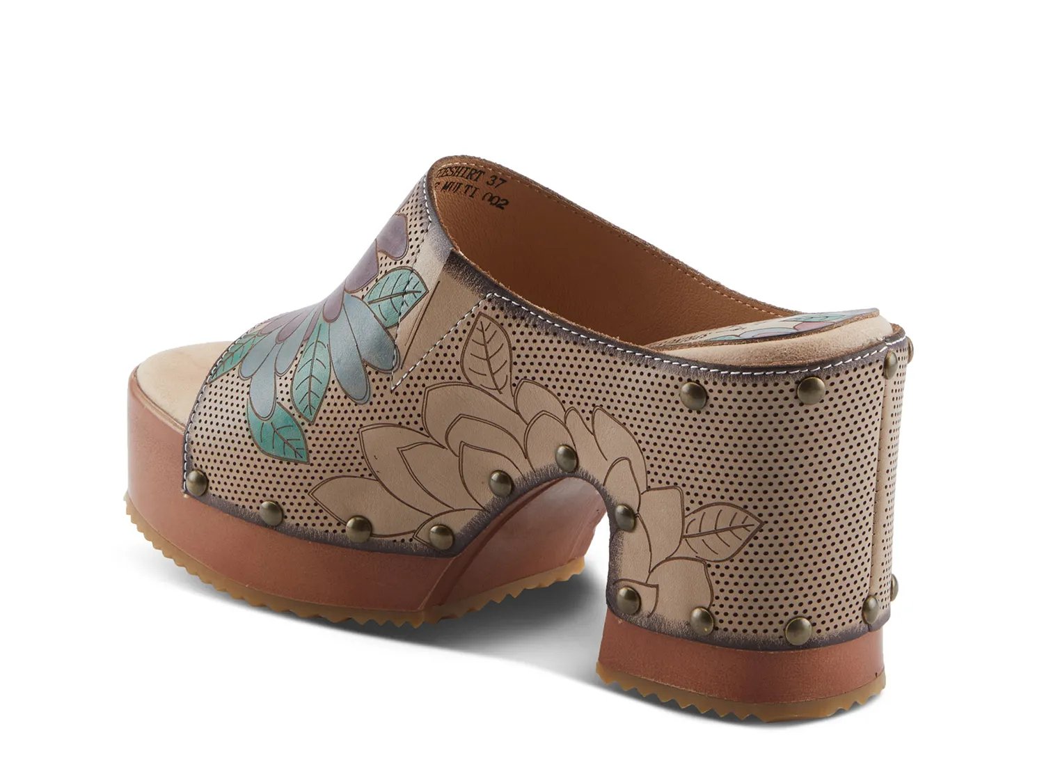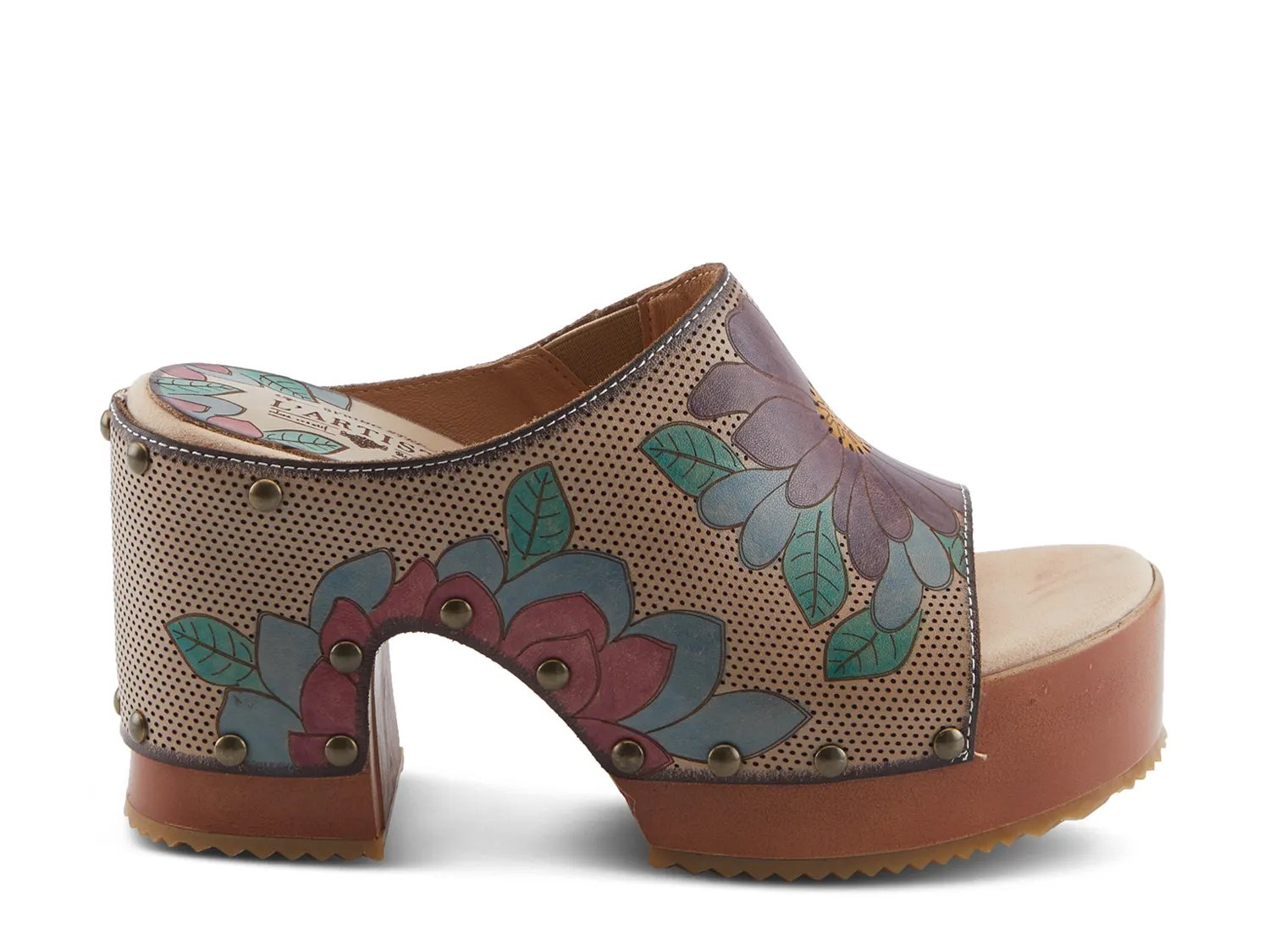 Выведите свой стиль на новый уровень с этими босоножками на платформе Teeshirt от L'Artiste. Эти шикарные туфли-слипоны придают изюминку благодаря расписанным вручную цветам и декоративной перфорации на кожаном верхе. Подошва украшена бронзовыми заклепками, придавая ей нотку грубой элегантности. Мягкая стелька и ретро-платформа обеспечивают комфорт и стильный вид.