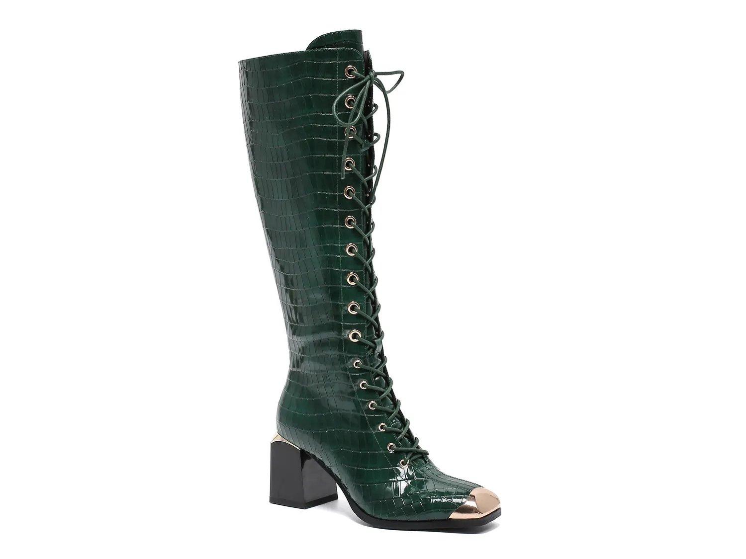 В ботинках Fuji от Ninety Union все взгляды будут прикованы к вам. Эти высокие ботинки до колена отличаются эффектной шнуровкой спереди, массивным блочным каблуком и отделкой под крокодила, что добавляет им выразительности.