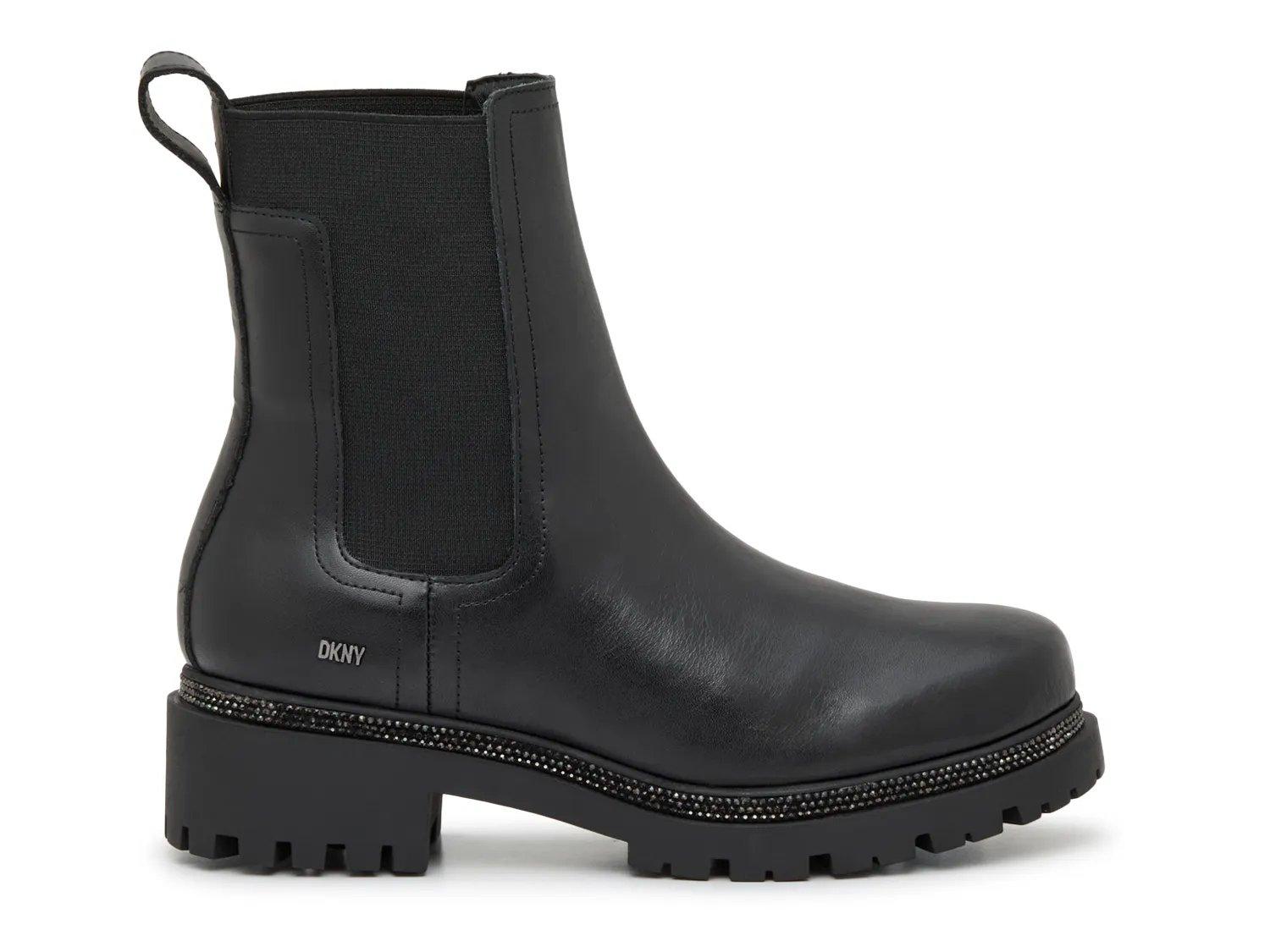 Выбирайте стильные ботинки DKNY Rick Chelsea. Гладкий верх, удобная мягкая стелька и удобная конструкция с эластичными вставками по бокам. Элегантный блочный каблук и отделка стразами привлекают внимание, легко дополняя ваш образ.