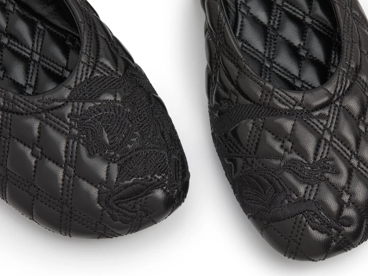 Добавьте своему образу вневременной штрих, надев балетки Saddler от Burberry. Эта пара простого силуэта с изысканными деталями выполнена из роскошной кожи, имеет изысканный стеганый верх и вышитый логотип на носке.