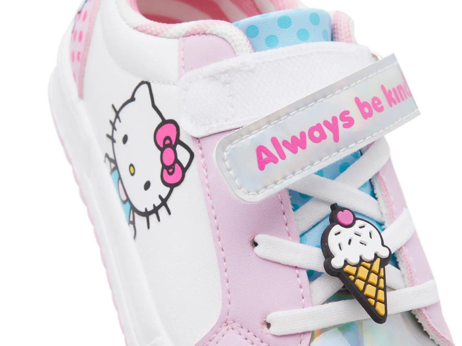 Добавьте милый штрих к спортивному стилю вашего малыша с кроссовками Hello Kitty от Ground Up. Эти яркие кроссовки украшены боковинкой любимого кота, деталями в горошек, металлическим оттенком и декоративным элементом в виде рожка мороженого. Конструкция без завязок и ремешок на липучке надежно фиксируют пару.