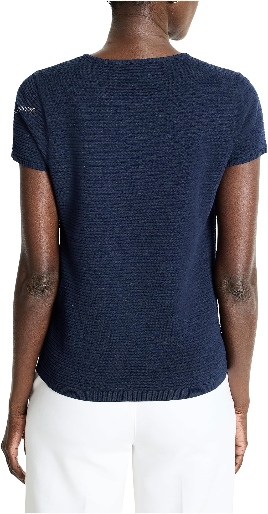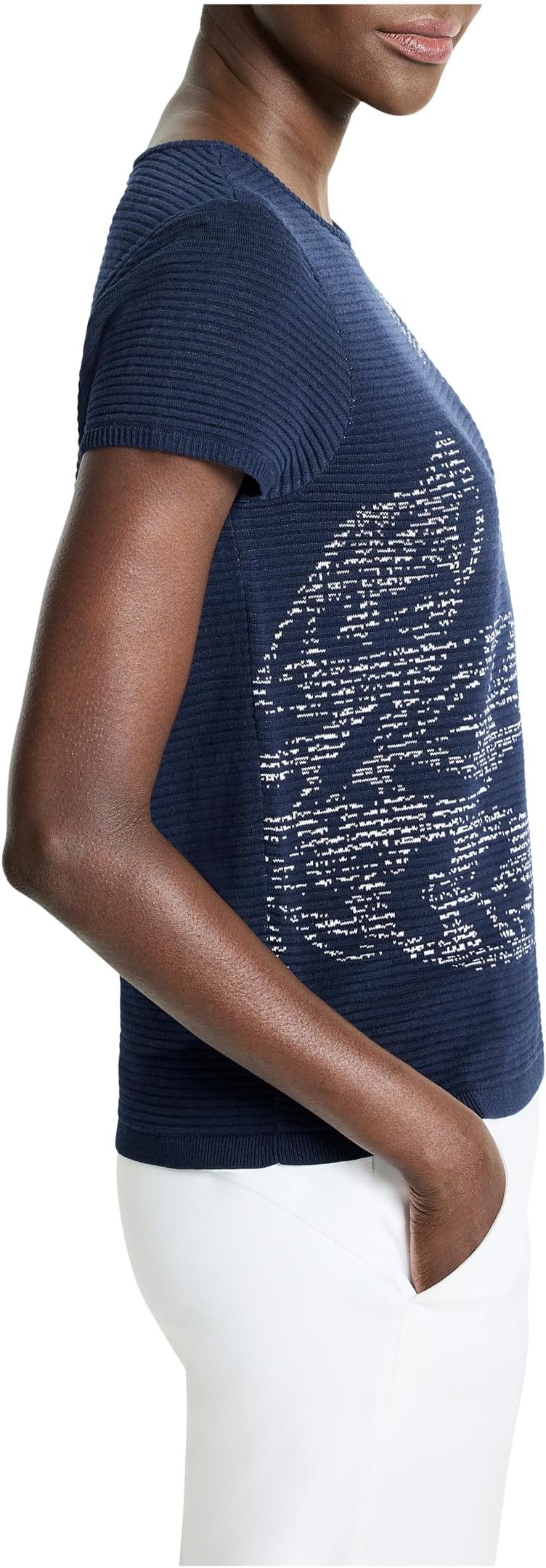 • Футболка-свитер NIC+ZOE Midnight Garden - это трикотажная футболка-свитер, которая мгновенно становится стильной: ее удобно носить на работу или на повседневные мероприятия. Изысканная техника османского стежка и жаккардовый узор в кремовых и индиговых тонах создают изысканное взаимодействие текстуры и нежного рисунка. Футболка, которую можно надевать через голову, имеет круглый вырез горловины, короткие рукава, прямой подол и ребристую отделку. Трикотаж из смесовой хлопковой ткани, обеспечивающей дополнительную драпировку, имеет немного более облегающий профиль, чем стандартная футболка-свитер.