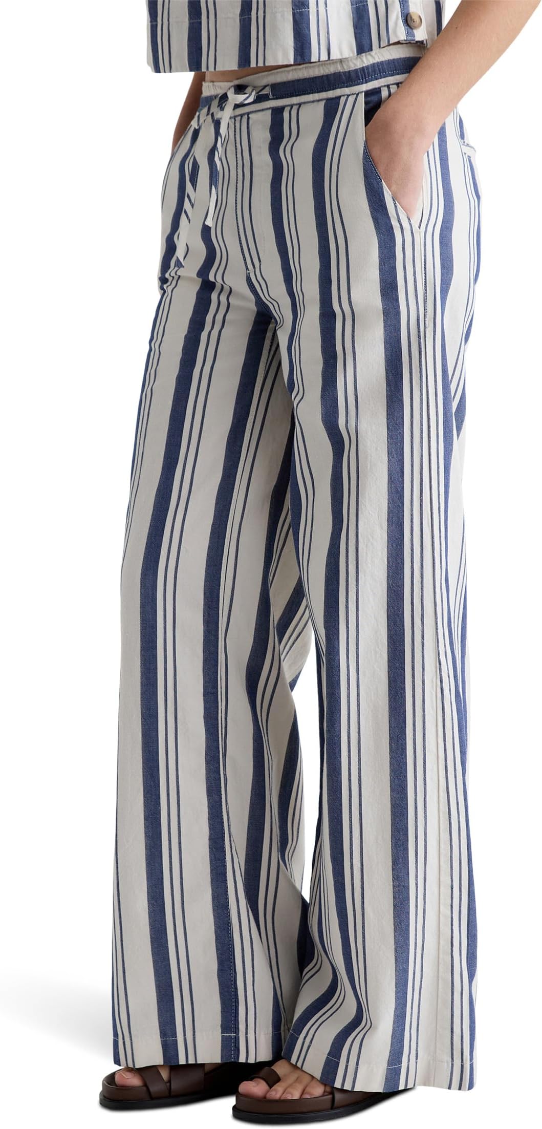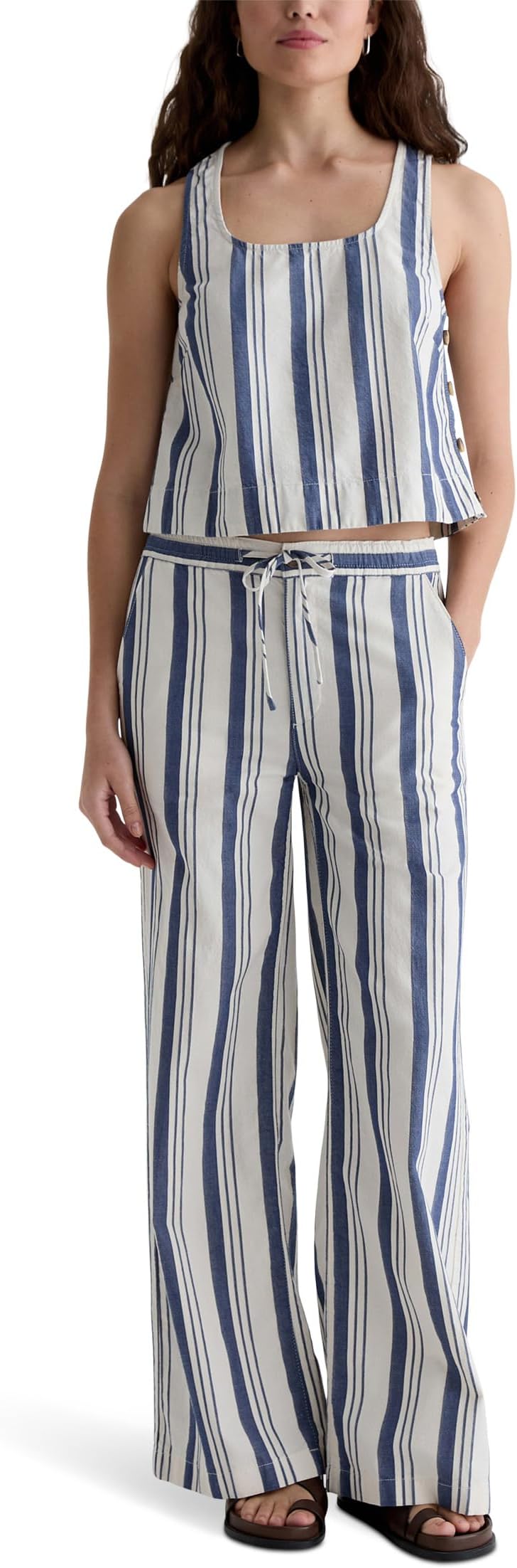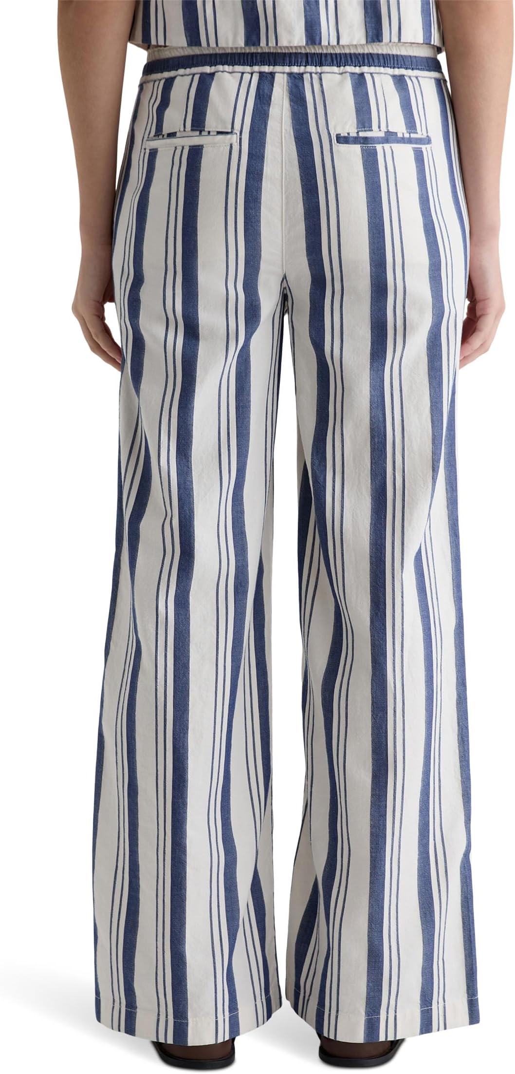 • Брюки AG Jeans Carolyn Pull On Wide Leg in Line Up с эластичным поясом и шнурком. Изготовлены из легкой и комфортной льняной ткани, которая создает непринужденный и стильный летний образ. Средняя посадка, два боковых кармана для рук и два задних кармана.