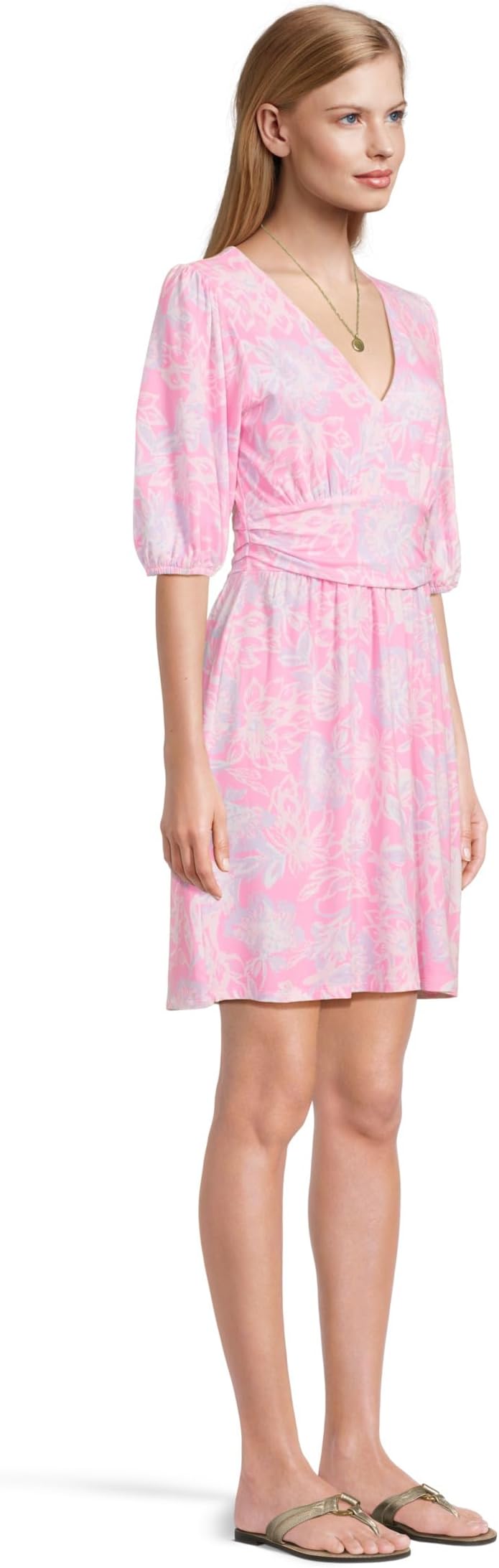 • Создайте непринужденный образ в платье Lilly Pulitzer Brightan. Это платье с V-образным вырезом, плиссированным поясом и рукавами до локтя. Платье украшено цветочным принтом по всей поверхности и имеет силуэт выше колена.