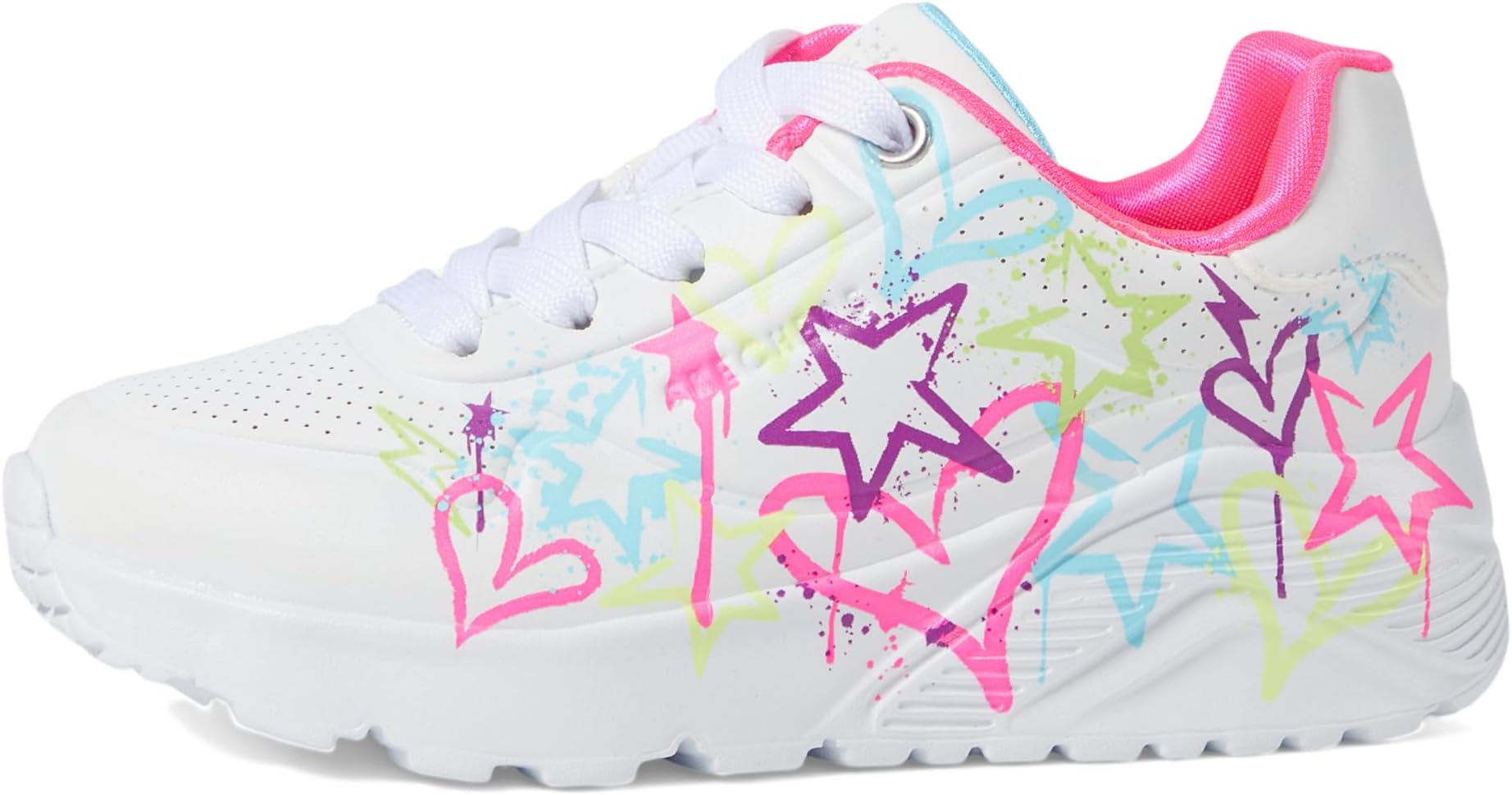 • Подчеркните милый и стильный образ вашего малыша в кроссовках SKECHERS KIDS Uno Lite - My Drip 310391L. Эти стильные кроссовки оснащены комфортной стелькой Air-Cooled Memory Foam, амортизирующей клиновидной подошвой и принтом в виде звезд и сердец по всей поверхности.