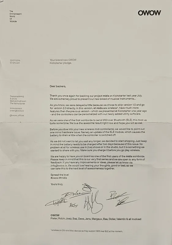 Это из оригинального набора GoFundMe, который я поддержал.В комплекте есть письмо от команды, 3 USB MIDI кабеля,