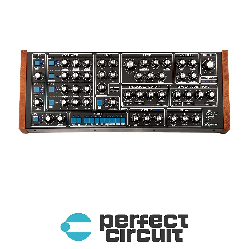 GS e7 является полифоническим аналоговым синтезатором с субтрактивным синтезом.Генерация звука осуществляется полностью аналоговым способом.Каждый голос имеет два управляемых напряжением осциллятора , генератор шума, микшер, управляемый напряжением фильтр и управляемый напряжением усилитель .Сигналы управления создаются цифровым образом с помощью микроконтроллера, который способен обрабатывать три низкочастотных осциллятора и два огибающих контура типа ADSR.Кроме того, он оснащен процессором эффектов с хорусом и задержкой.Интерфейс GS e7 был разработан, чтобы быть простым и интуитивно понятным.Также он имеет MIDI-подключения, USB, балансные стерео-аудиовыходы, выход для наушников и входы CV.