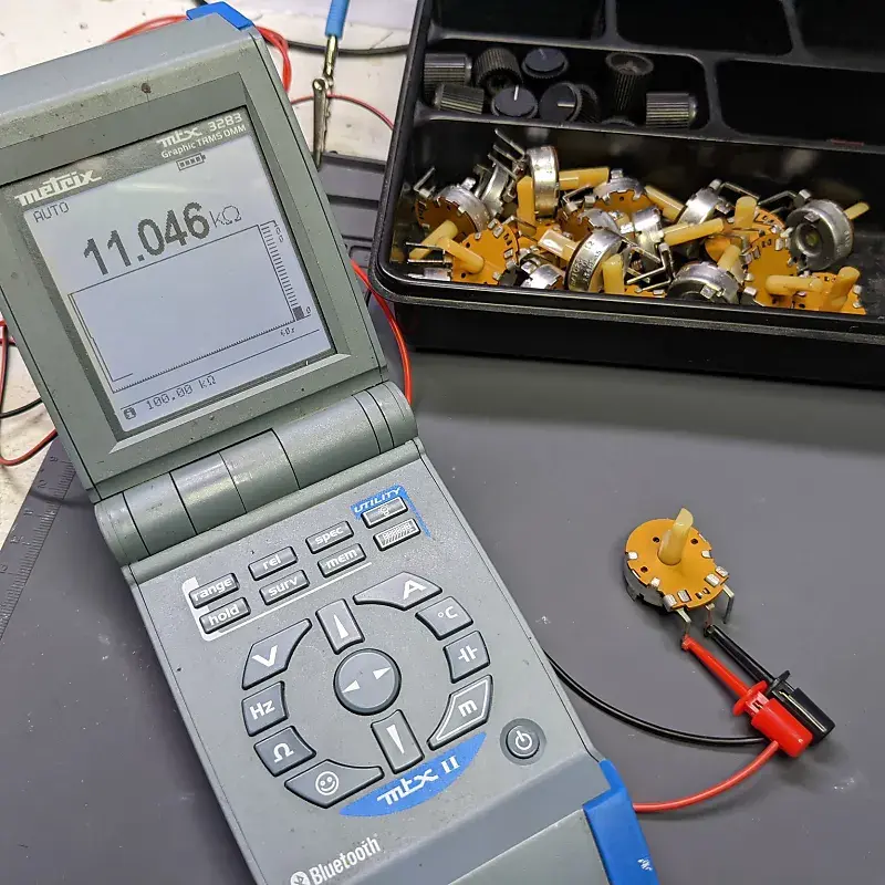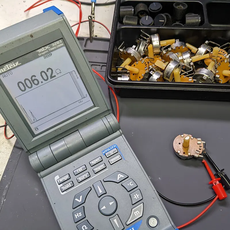 Наконец, каждый потенциометр был протестирован на правильное сопротивление и линейность, и была проверена работа без прерываний при помощи моего графического мультиметра.Все потенциометры для p600 имеют линейность 10K - все эти экземпляры находятся в пределах допустимого отклонения .