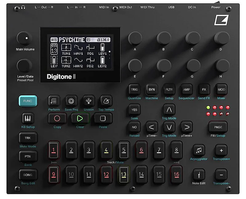 16-голосный многотипный цифровой синтезатор.4 × синтезаторные машины .6 × фильтровые машины .Секвенсор на 16 треков синтезатора или MIDI.Base-Filter.3 × LFO и уменьшение битности + частоты дискретизации для каждого голоса, назначаемое.128 шагов на паттерн и трек.1 арпеджиатор и редактирование нот для трека.Полифонические последовательности.Индивидуальная длина треков.Блокировка параметров.Условие запуска .Микротайминг.Смена звука на шаге.Евклидический генератор.Эффекты send: хор, дилей и реверб.Мастер овердрайв.Поддержка Overbridge.2 аудиовхода с 1/4-дюймовыми несимметричными разъемами.2 аудиовыхода с 1/4-дюймовыми симметричными разъемами.Выход для наушников.Порт USB 2.0.MIDI In/Out/Thru.Размеры: 215 × 176 × 63 мм.Вес: 1,48 кг.