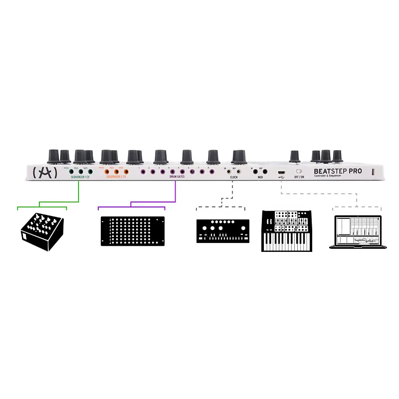 Beatstep Pro представляет собой два независимых мелодических секвенсора и один драм-секвенсор.Каждая мелодическая последовательность может быть длиной до 64 шагов с индивидуальной артикуляцией высоты, скорости и длительности ноты.Это самые мощные пошаговые секвенсоры, которые когда-либо создавались.Драм-секвенсор имеет 16 отдельных дорожек на последовательность .Записывайте в реальном времени с пэдов или используйте кнопки шагов для классического рабочего процесса драм-машины.Подключайтесь практически к любому музыкальному устройству: компьютерам, виртуальным инструментам, модульным синтезаторам, драм-машинам; ко всему, что поддерживает USB, MIDI вход и выход, CV/Gate выходы, Clock вход и выход, или DIN sync.