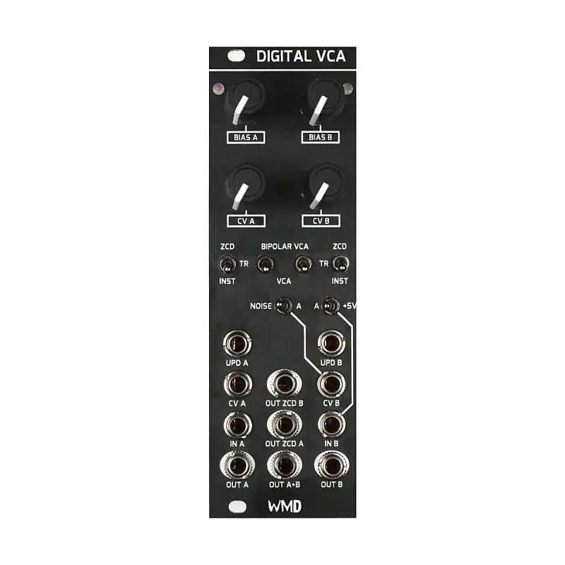 Цифровой VCA пропускает сигнал как обычный VCA, но уровень CV и ослабления управляется цифровым способом.Это позволяет, например, дождаться нулевого пересечения, чтобы изменить амплитуду, что приводит к изменениям амплитуды без щелчков.