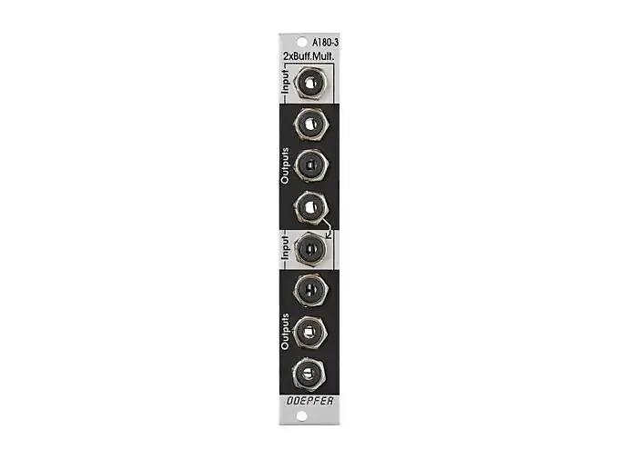Doepfer A-180-3 Буферные Распределители представляют собой двойной буферный 1-в-3 распределитель.Сигнал, поданный на входной разъем, появляется в виде буферного сигнала на трех выходных разъемах.Каждый выход имеет свой собственный буфер, то есть три выходных разъема не соединены напрямую друг с другом.Нижний выход верхнего модуля по умолчанию соединен на заводе с входом нижнего модуля.Таким образом, модуль работает как единый 1-в-6 буферный распределитель при условии, что на вход нижнего модуля не подан сигнал.Но также возможно снять шину CV и нормализовать входной разъем нижнего модуля на шину CV.