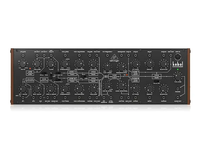 Behringer Kobol-Expander - это аналоговый полу-модульный синтезатор с 2 VCO, обладающий 7 переменными формами волн и уникальным фильтром «Kobol» VCF в формате Eurorack.