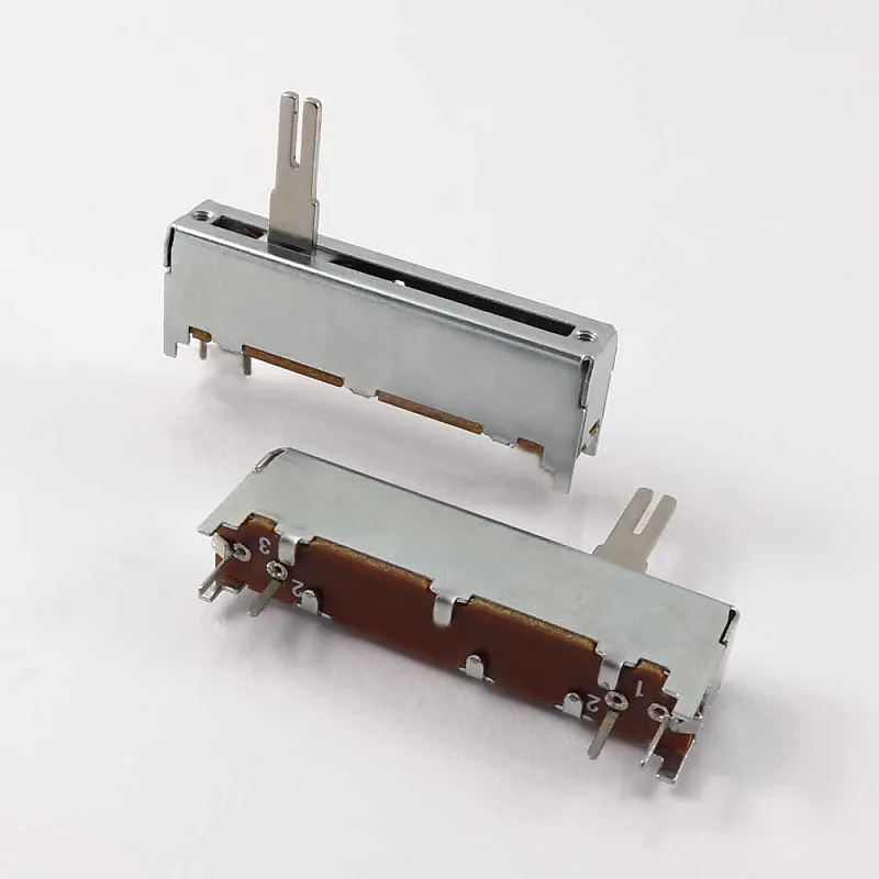 Этот ползунковый потенциометр ранее использовался во многих инструментах и аудиооборудовании.Особенность данной модели потенциометра заключается в расположении паяльных контактов и высоте корпуса, что сегодня встречается редко.Всего четыре паяльных контакта расположены по бокам, образуя две группы контактов вверху и в конце ползункового потенциометра.