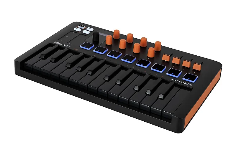 Портативный дизайн, полная студийная функциональность.Благодаря непревзойденной приверженности Arturia исследованию и разработке синтезаторов неудивительно, что последняя версия их мини-MIDI устройства превзошла своего предшественника.MiniLab 3 сохраняет 25-клавишную раскладку, отличается тонким профилем и весит чуть более трех фунтов.Эргономичная форма включает два емкостных сенсора для управления тоном и модуляцией соответственно.Восемь сенсорных и чувствительных к давлению пэдов разделены на два банка, всего 16 полностью назначаемых слотов с подсветкой RGB.Восемь ротационных энкодеров дополняются четырьмя высококачественными слайдерами для обеспечения гибких схем управления.Новый мини-дисплей оснащен вращающимся регулятором с возможностью нажатия, предоставляющим обратную связь в реальном времени о внесенных изменениях и модификациях к любому из 500 пресетов MiniLab 3.Интуитивно понятная функциональность позволяет легко управлять транспозицией по октаве или полутонам, режимами удержания и аккорда, а также встроенным арпеджиатором.Пользовательские сценарии для DAW.разработаны для интеграции с основными рабочими станциями,