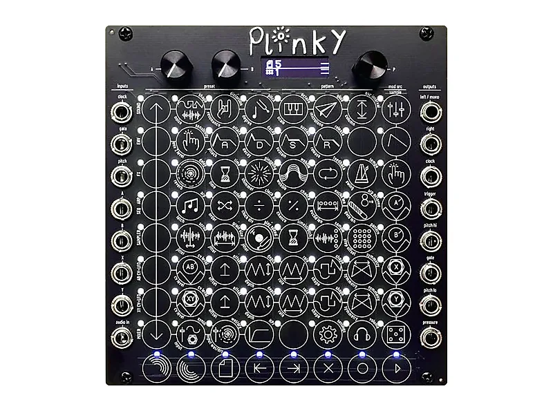 Plinky - это 8-голосный полифонический сенсорный синтезатор, который специализируется на хрупких, меланхоличных звуках.Думайте о нем как об инструменте с 8 струнами, на котором играют, касаясь 64 основных пэдов, расположенных в 8 вертикальных монофонических полос или струн.Вы можете сразу начать играть на Plinky с помощью этих 64 основных пэдов.Ряд из 8 клавиш «shift» внизу используется вместе с основными пэдами для выбора параметров, пресетов, паттернов секвенсора и семплов.Каждая из 8 струн имеет: до 4 осцилляторов или семплированные гранулы, детюненные небольшими движениями вашего пальца; генератор белого шума; ADSR-огибающую, управляющую......резонансным двухполюсным фильтром с низкой частотой.Вторичную ADSR-огибающую с повтором.Дисторшн / сатурацию.Plinky поддерживает 4 внешних источника CV-модуляции, называемые A, B, X и Y, каждый с собственным LFO.Для A и B также предусмотрены физические ручки смещения, расположенные слева от экрана.При изменении параметров вы можете использовать бесконечный энкодер, чтобы справа на экране для точной настройки параметров.Нажатие на энкодер также сбрасывает текущий параметр.Plinky также имеет глобальные блоки задержки, реверберации, фильтр высоких частот, лимитер и сатурацию, а также простой микшер , арпеджиатор, секвенсор и сэмплер.